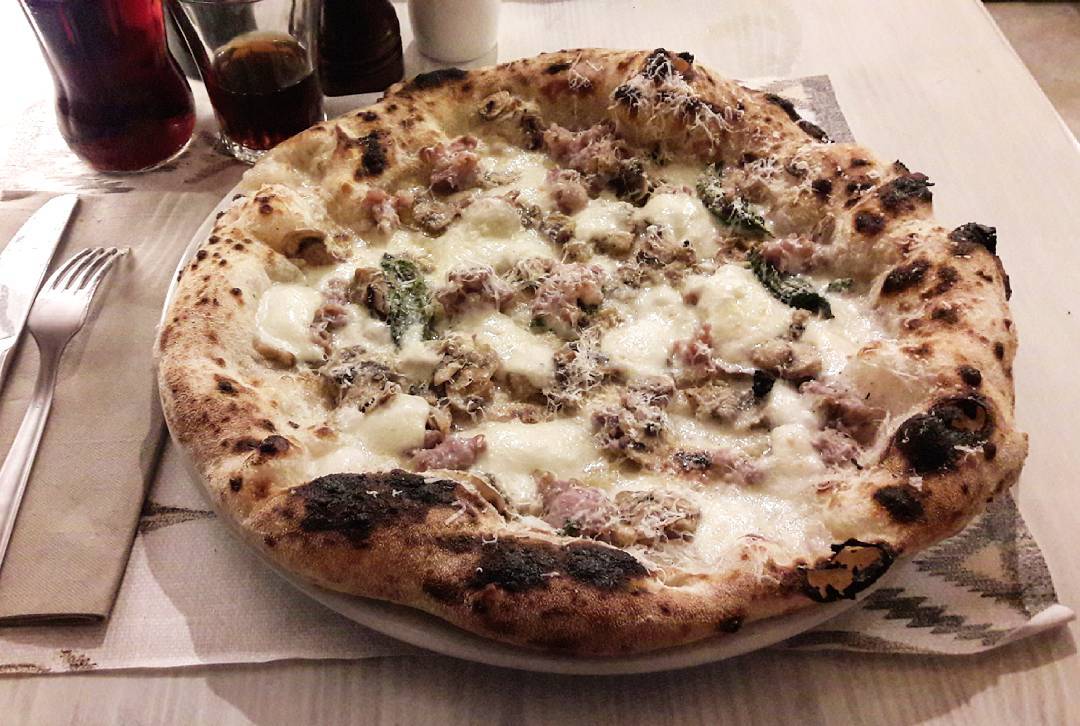 Poi la Solo per Caserta: salsiccia di maialino Nero Casertano, funghi selvatici, straccetti di mozzarella di bufala, pecorino di Laticauda, olio evo, su un impasto sofficissimo, digeribile e con una gradevole crosticina croccante.