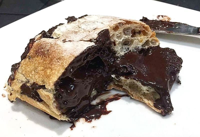 Il fine pasto poi è fantasticamente Proustiano… Un dessert semplice che spalanca l’album dei ricordi di infanzia, la merenda delle 4, la fragranza del pane, l’insozzarsi col cioccolato… Questo saltimbocca con cioccolato caldo fondente, cotto a bocca di forno napoletano, è un’originale delizia… che combatte la malinconia!