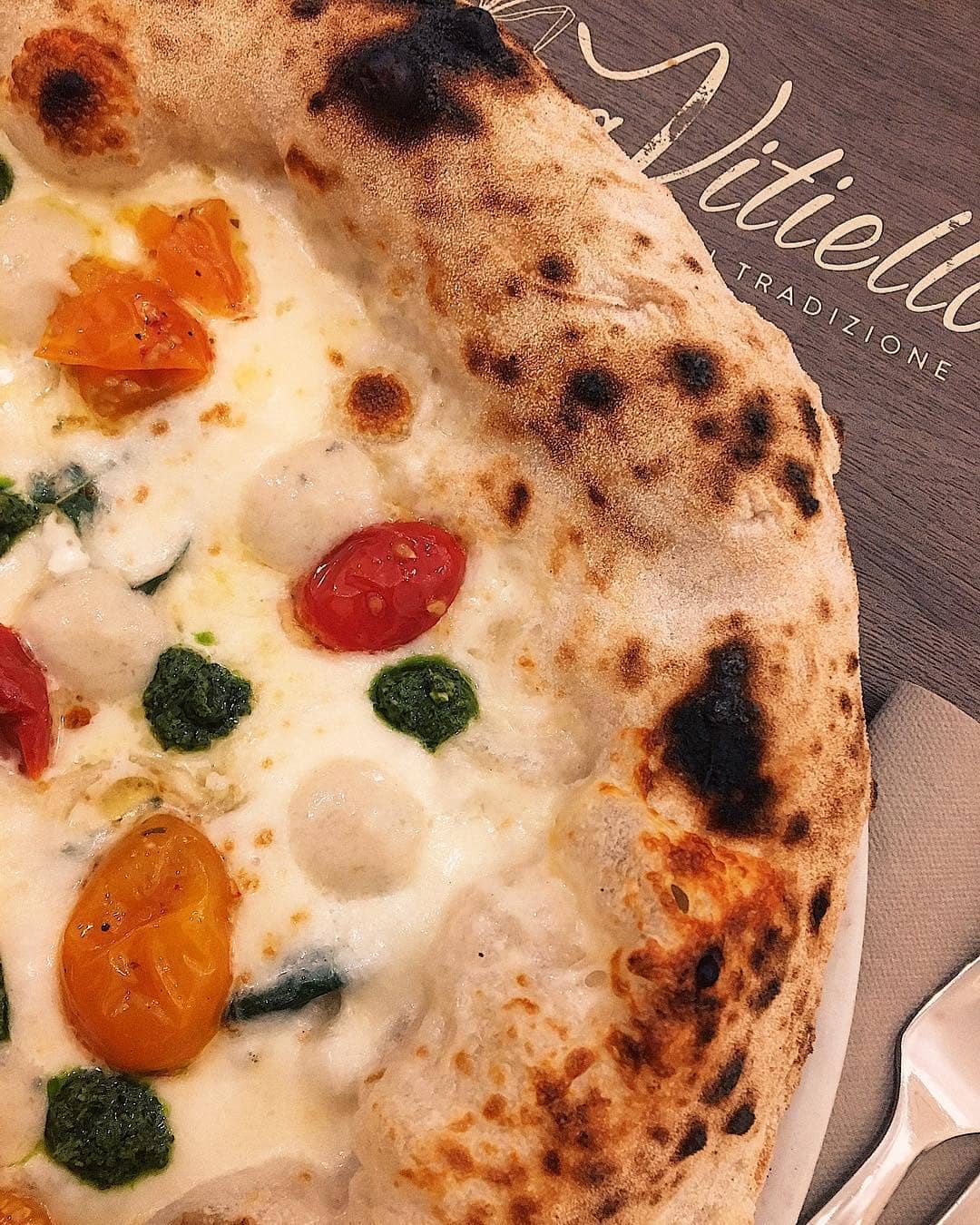 Che sta a Tuoro, borgo di Casertavecchia, tra quattro mura di tufo del Seicento, ci si sa. Del forno con la lastra ruotante all’interno e della molteplicità degli impasti pure ve ne ho parlato… Quello che “mi fa uscire pazz’ a me” è il morso della pizza di Ciccio Vitiello: al tatto è scrocchiarello e croccantino ma al palato langue come burro! Ti fa fesso e cuntento, ma a me cuntento assai: può assomigliare a quello di una pizza in teglia, più spesso. Ma è solo impressione, perché poi viene via da buona napoletana quale somiglia. Degna della sorella maggiore delle mie parti.