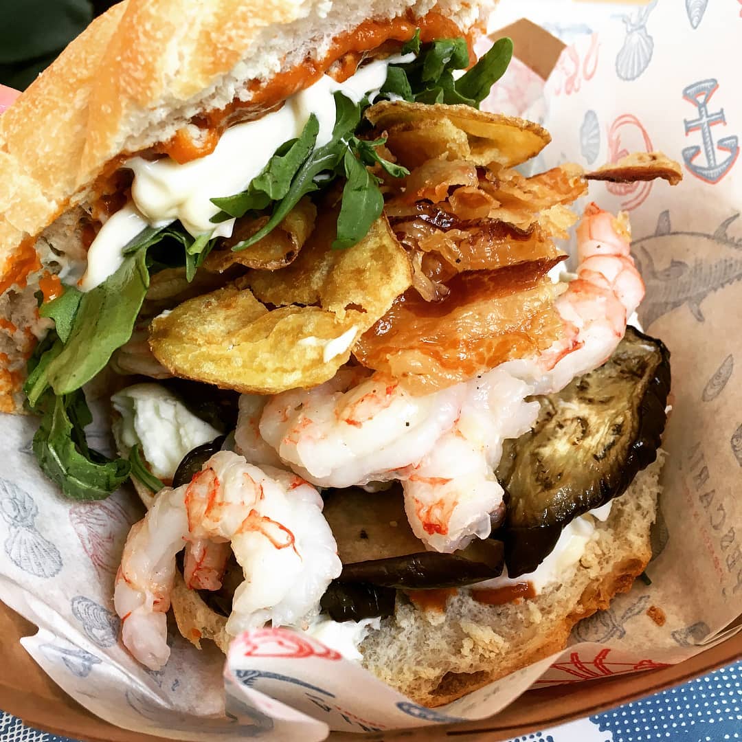 120g di gamberoni, melanzana fritta, pancetta croccante Salumificio Santoro, mozzarella di bufala, salsa al pomodoro e basilico, chips di patate, maionese affumicata.