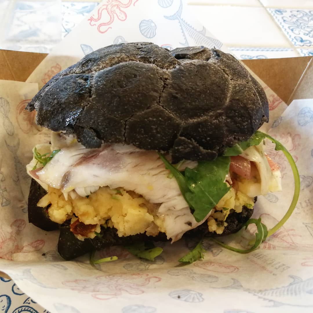 Panino nero di seppia, spigola marinata homemade agli agrumi, insalata di rucola, cipolla caramellata, insalata di patate di Polignano, fiordilatte, pesto al basilico.