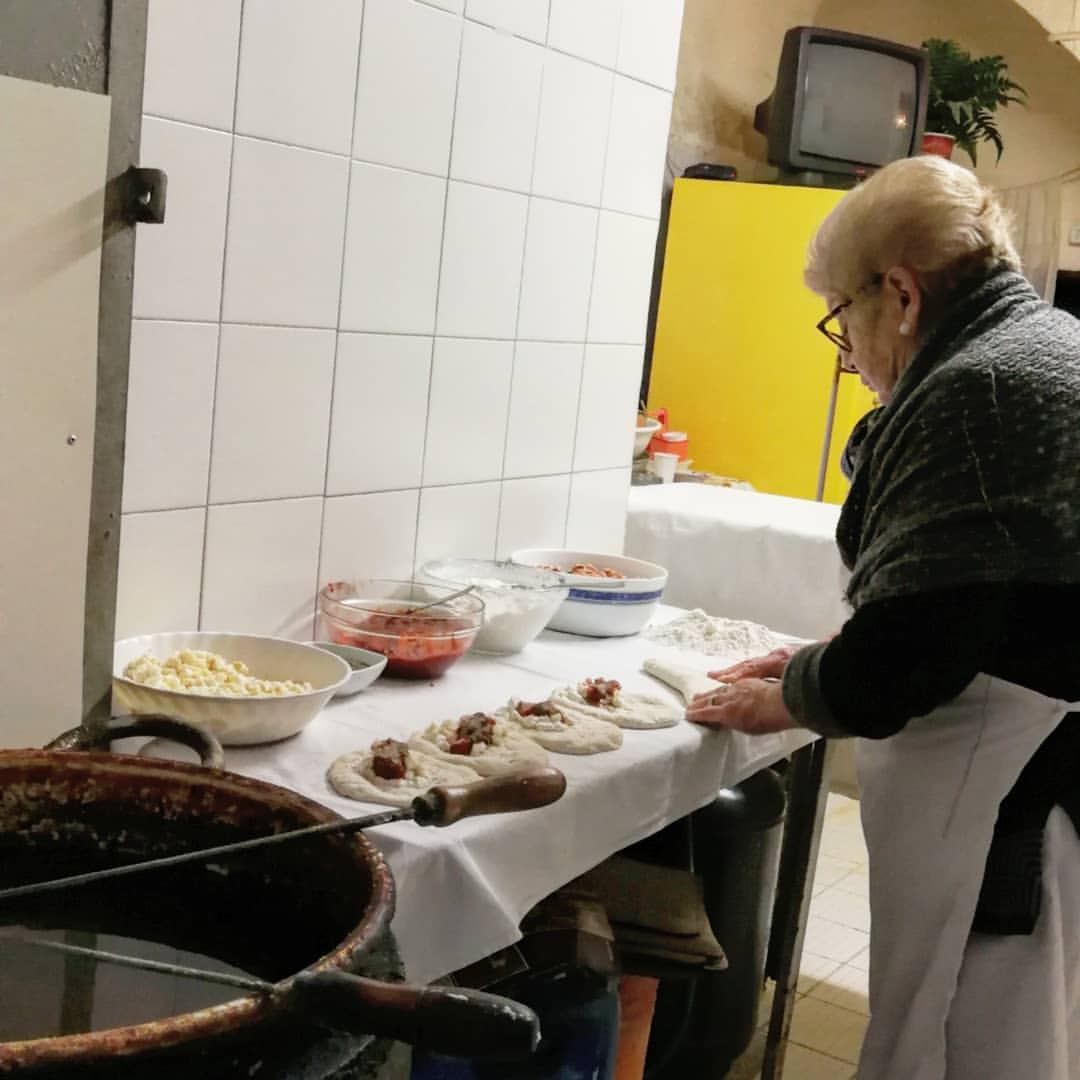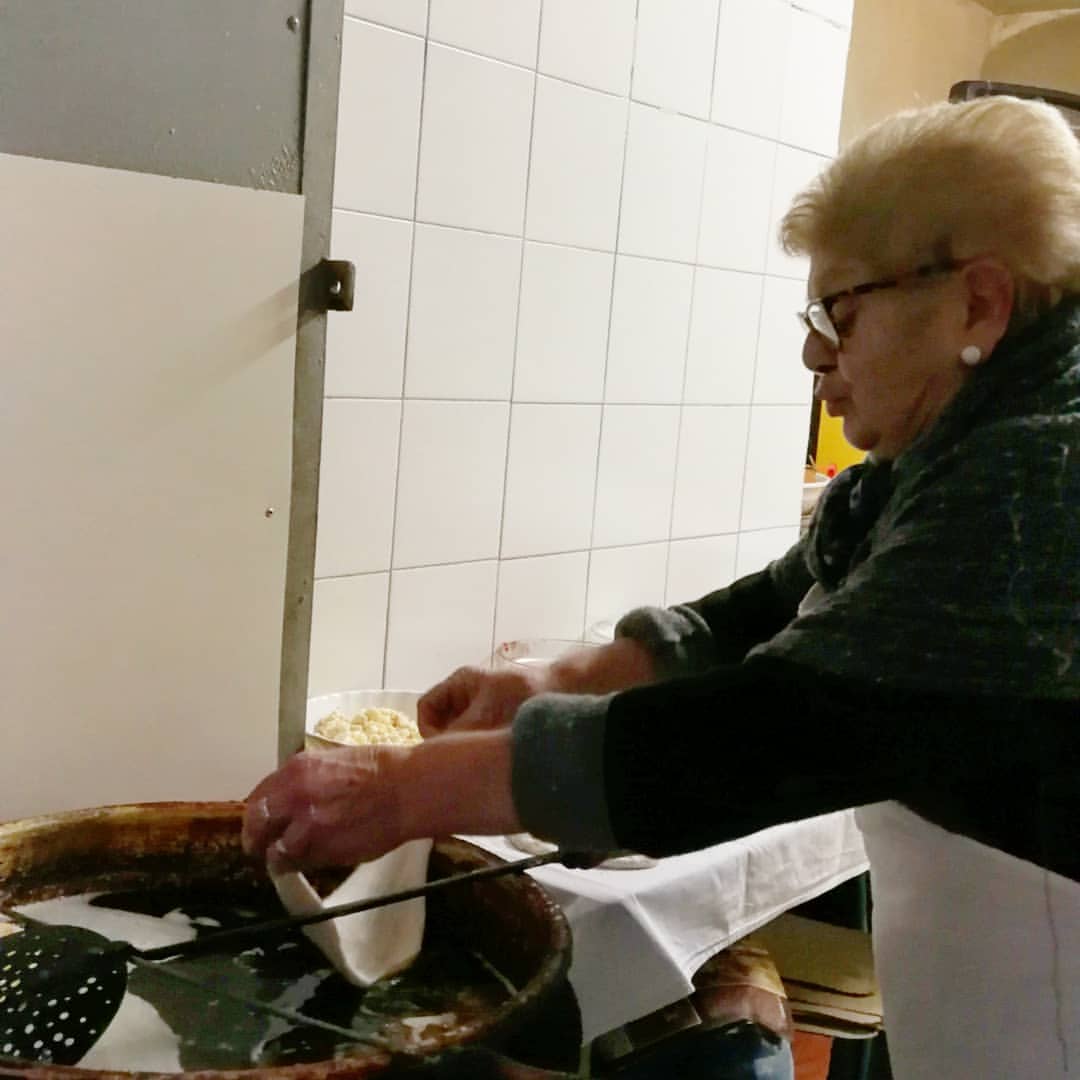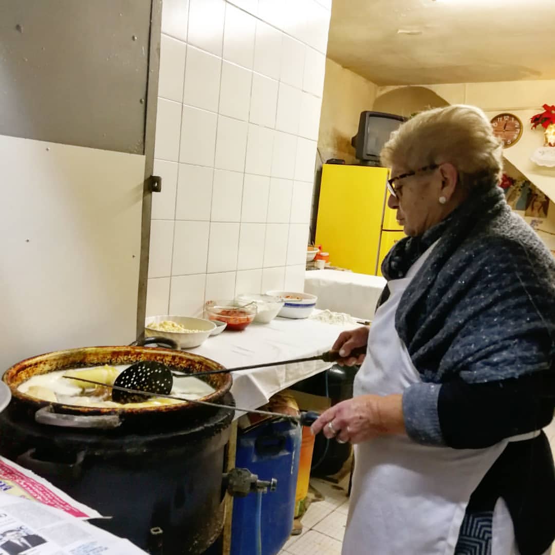 Quando arrivi ti ospita in quel che è il suo tempio e parte l’incanto: gesti semplici e antichi, cadenzati con precisione, lenti come lo splendore di chi fa le cose per bene… ed ecco servito lo scrigno, bollente e succulente, di magia: ricotta, cicoli, provola, sugo di pomodoro e pepe.