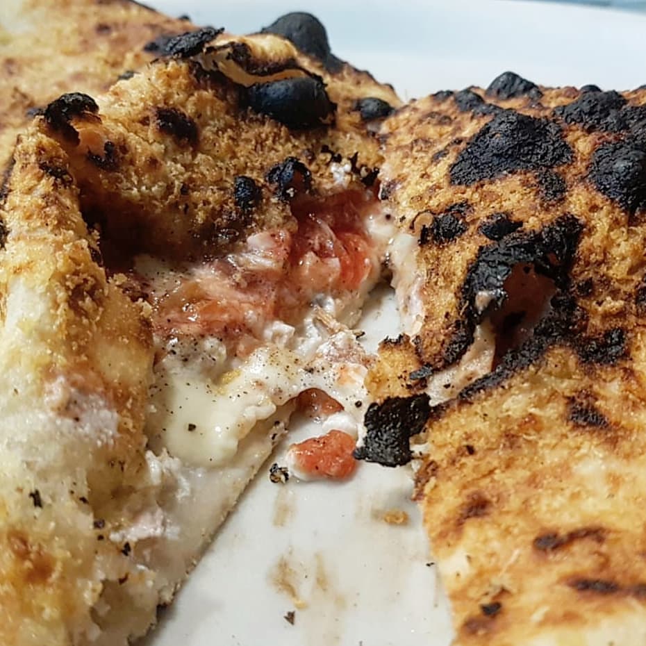 Una pizza al forno che sa di pizza fritta, con quella crosticina superficiale, disegnata dal formaggio che dona sapidità e croccantezza. E l’interno l’apice della fusione dei sapori, un piacere smisurato a cui ci si arrende docilmente.