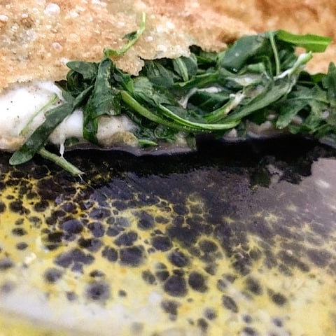 La pizza fritta è sottile e leggera, morbidissima, olio non pervenuto, neanche l’odore, ma come è stata fritta? Il ripieno classico con cicoli, ricotta, pepe e basilico, diventa un manifesto della bravura della pizzaiola.