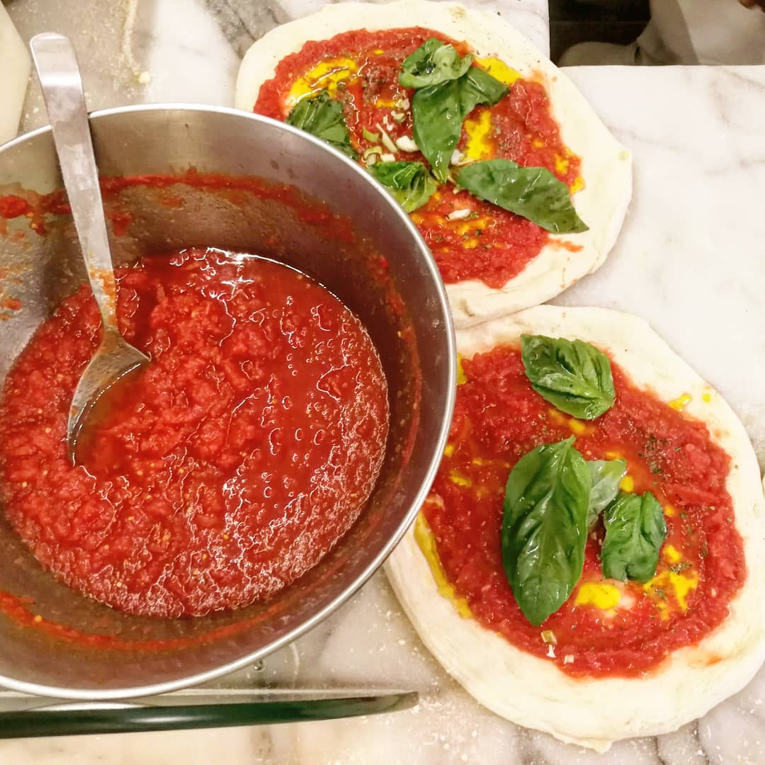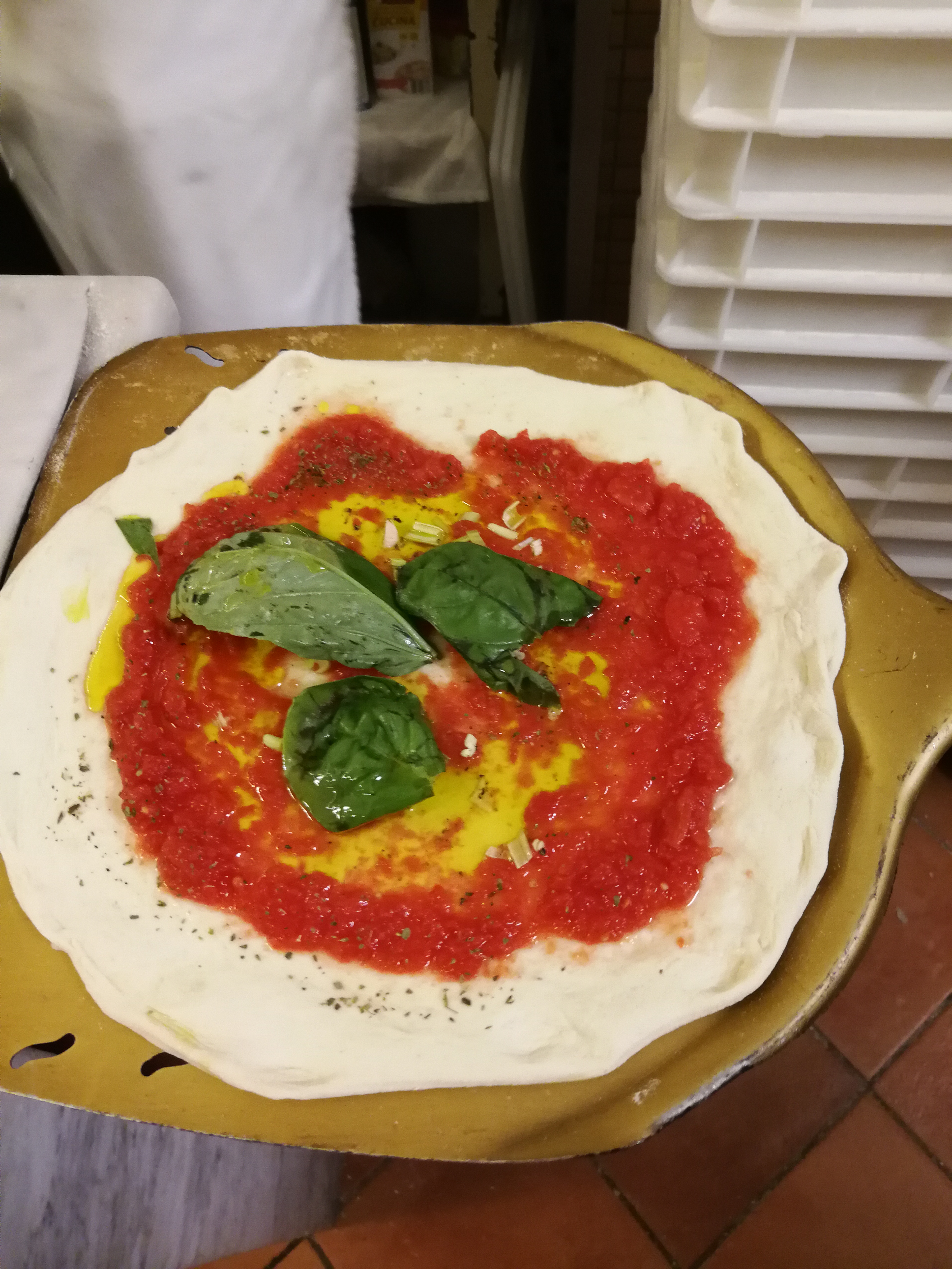 Pomodori San Marzano schiacciati, spremuti grossolanamente con le mani (una visione idilliaca), fiordilatte tagliato a tranci con la stecca (ne percepisco ancora quel suono cadenzato) nel caso della Margherita, aglio e origano per la Marinara…