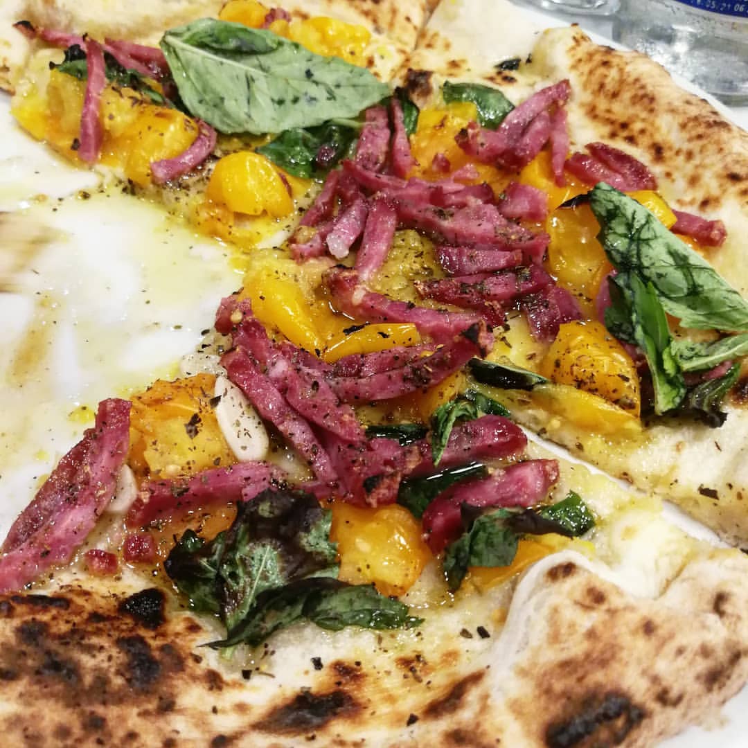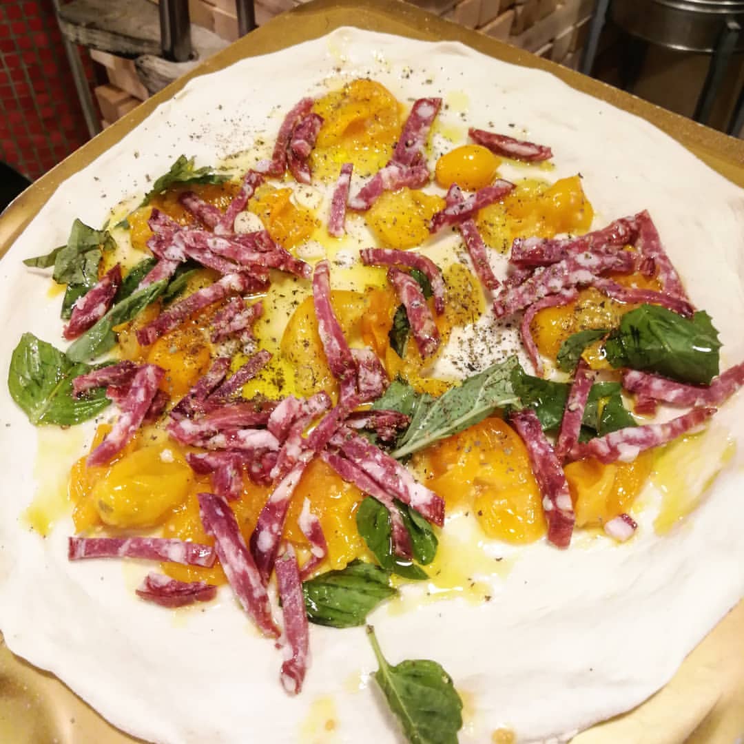 La Don Alberto è l’essenza di tutto ciò: marinara con pomodorino giallo, arricchita di salame napoletano e basilico riccio napoletano…