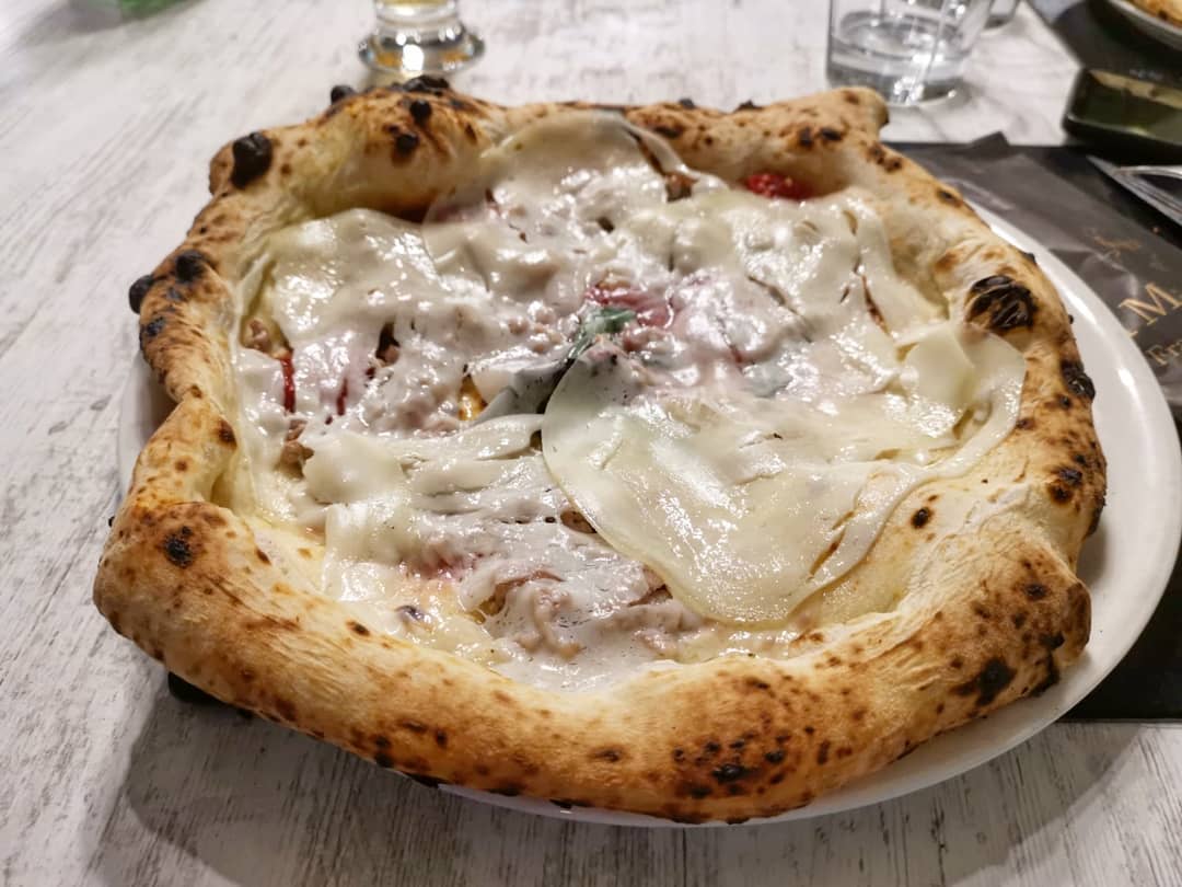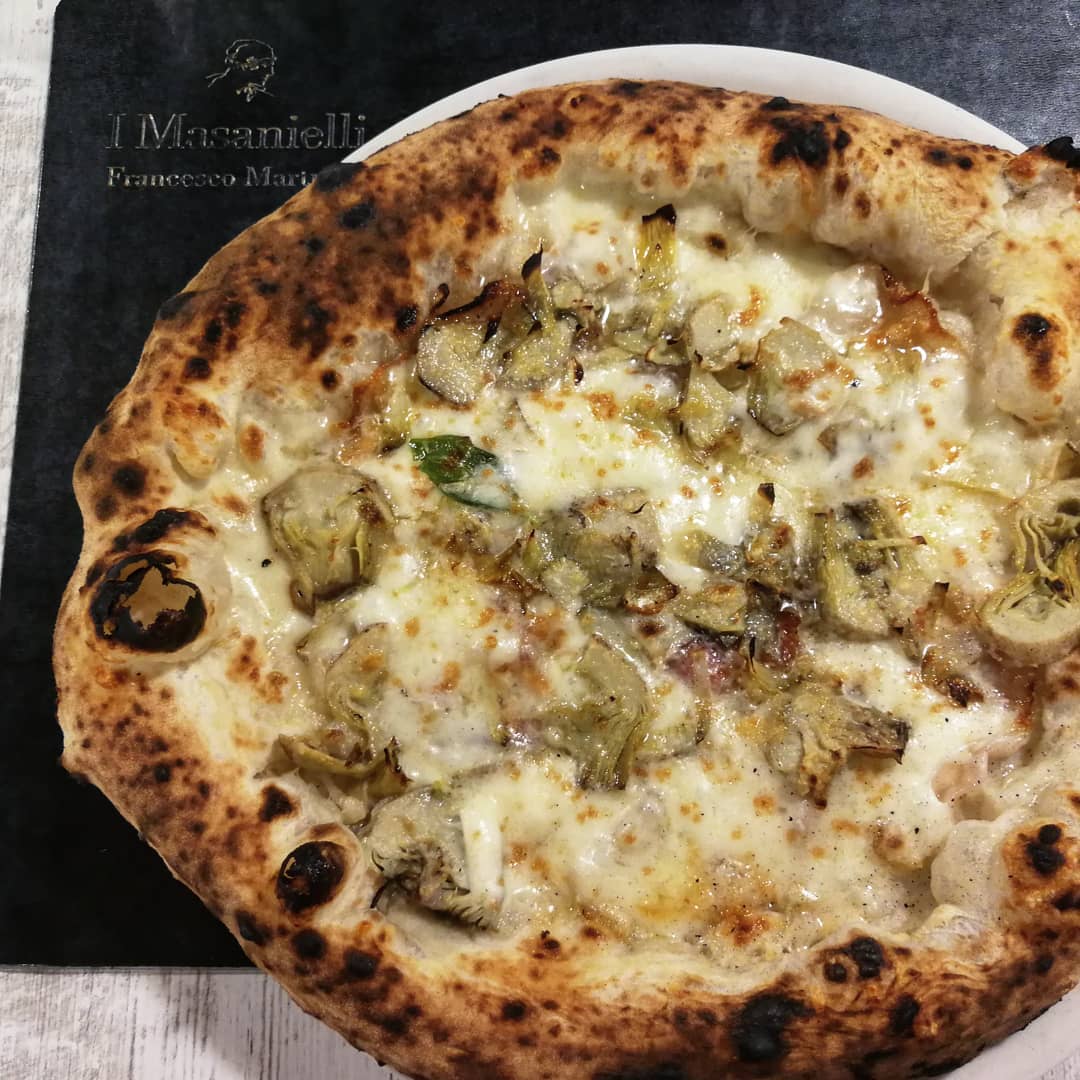 Tralasciando le mirabilia dell’impasto già espresse, si celebra il condimento perfettamente in armonia: la Lorenzo, con guanciale croccante di Maiale tranquillo, provola affumicata, carciofo violetto, Calcagno a crosta liscia. Una fantastica sorpresa, il carciofo che vince sugli scetticismi e regala gioie, spinto dalla sapidità del pecorino e dalla ciccia del guanciale. Qui il bis è d’uopo!