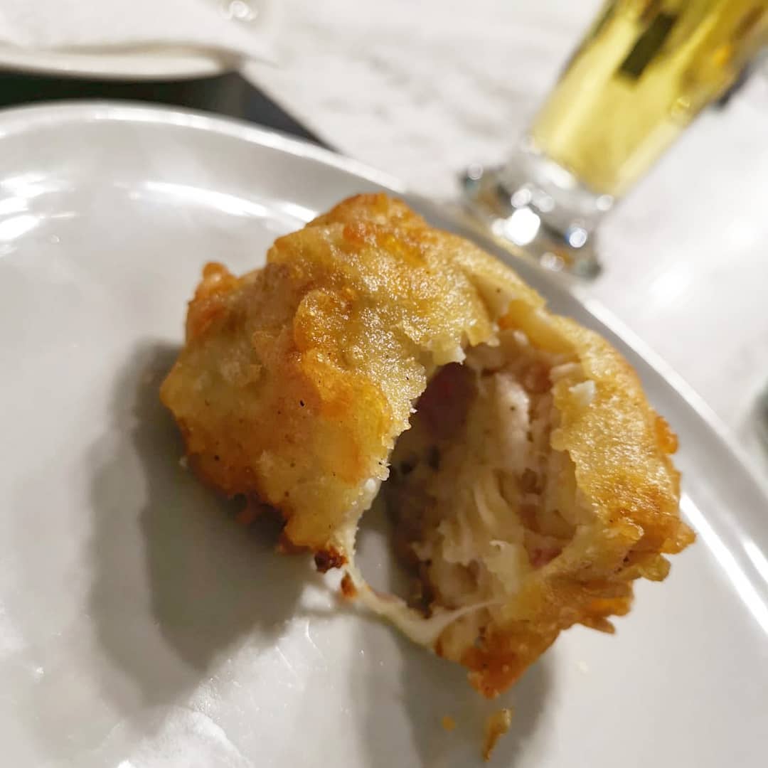 Il crocché è sublime, la patata è fresca, esiste ed è tangibile, senza condimenti moscati, senza pesantezze; non sa di purè, non è farinosa, non asciuga. Ha del prosciutto e del formaggio sciolto a ingolosire, ma la patata predomina.