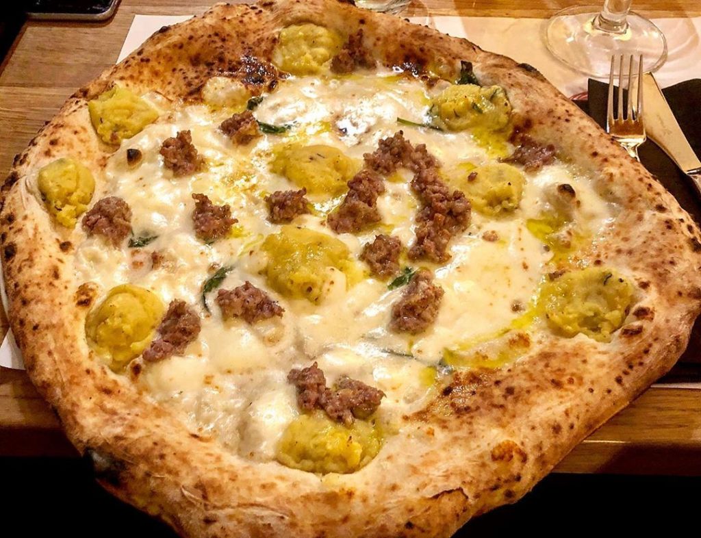 Armoniosa la Salsiccia, Patate e Menta: bianca con fiordilatte di Agerola, salsiccia di suino brado “grigio del Casentino”, fiocchi di patata alla menta e al Parmigiano Reggiano grattugiato. Il grasso suino, la dolcezza della purea di patate e la freschezza della mentuccia.