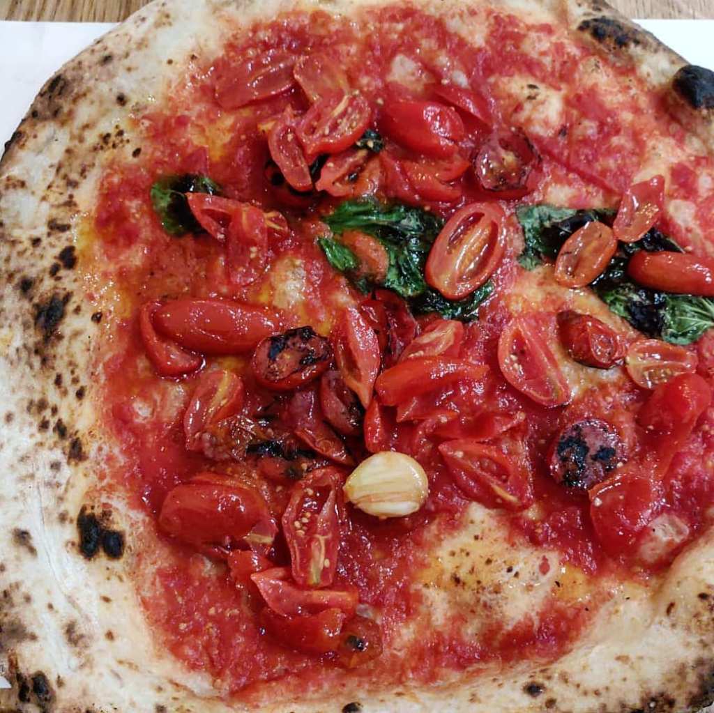 Una selezione di 6 pomodori diversi che si incontrano su una stessa pizza: pomodoro di Corbara, pomodoro San Marzano DOP al naturale, pomodoro datterino essiccato al forno, pomodoro grigliato, crema di pomodoro affumicato, pomodori del Piennolo del Vesuvio arinati in olio e basilico, olio extravergine del frantoio San Comaio, basilico fresco. Una magia nata con lo chef stellato Salvatore Bianco, che ricostruisce un ortaggio attraverso il collage fra i ricordi proustiani come il cuzzitiello della nonna sporcato di ragù, la bruschetta, la fresella, il pane col pomodoro. Un gioco alla tradizione, ancestrale al massimo nel gusto ma innovativo nella realizzazione: la coesistenza di acidità, dolcezza, affumicato e dell’appena percepibile, amarezza dei pomodori abbrustoliti è coinvolgente e anche l’olfatto ne trae giovamento.
