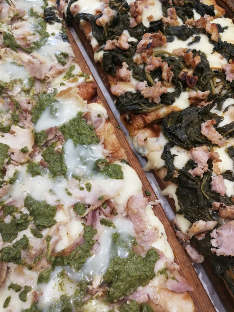 La proposta è al passo con i tempi e spazia dai classici al contemporaneo (né tradizionale né gourmet): marinara, margherita, parigina, cacio e pepe, pizza con scarola, salsiccia e friarielli, alternando le proposte al banco con gusti più gourmet come pancetta, pecorino e fichi oppure porchetta di Ariccia, fiordilatte, crema di friarielli e fonduta di pecorino oppure crudo di Parma doppia corona, rucola e squacquerone DOP oppure mortadella, stracciatella e tarallo al pistacchio homemade.