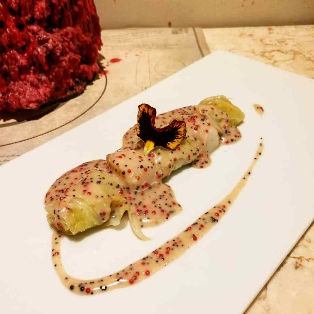 Capesante scottate con cavolo cappuccio brasato nel burro nocciola e uova di lombo, tanto per antipastare, dove la leggerezza dei molluschi abbraccia la consistenza del cavolo e le uova, oltre ai cromatismi, esplodono il mare al palato.