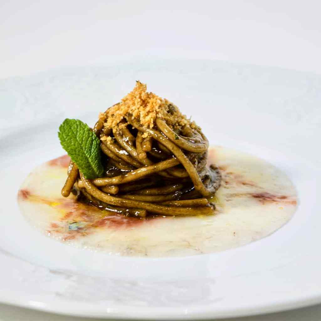 Note di mare e di terra anche per i “Vermicelli alla Borbonica” (spaghetti all’aglio nero, olio e peperoncino, su carpaccio di orata e mollica di pane), una rivisitazione di un piatto povero di lontane origini dipinto da Ippolito Cavalcanti. Od ancora “La braciola”, ideata dai Monzù che nella versione di Palamaro è farcita con pizza di scarola, salsa di pinoli tostati e alici di Cetara. Piatti tipici, o meglio storici ma al contempo innovativi in quanto rivisitati nella forma, nella presentazione, o nell’aggiunta di un ingrediente diverso.