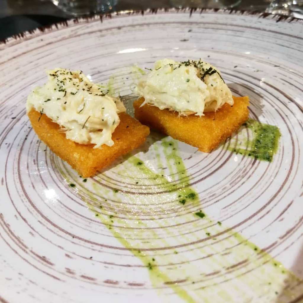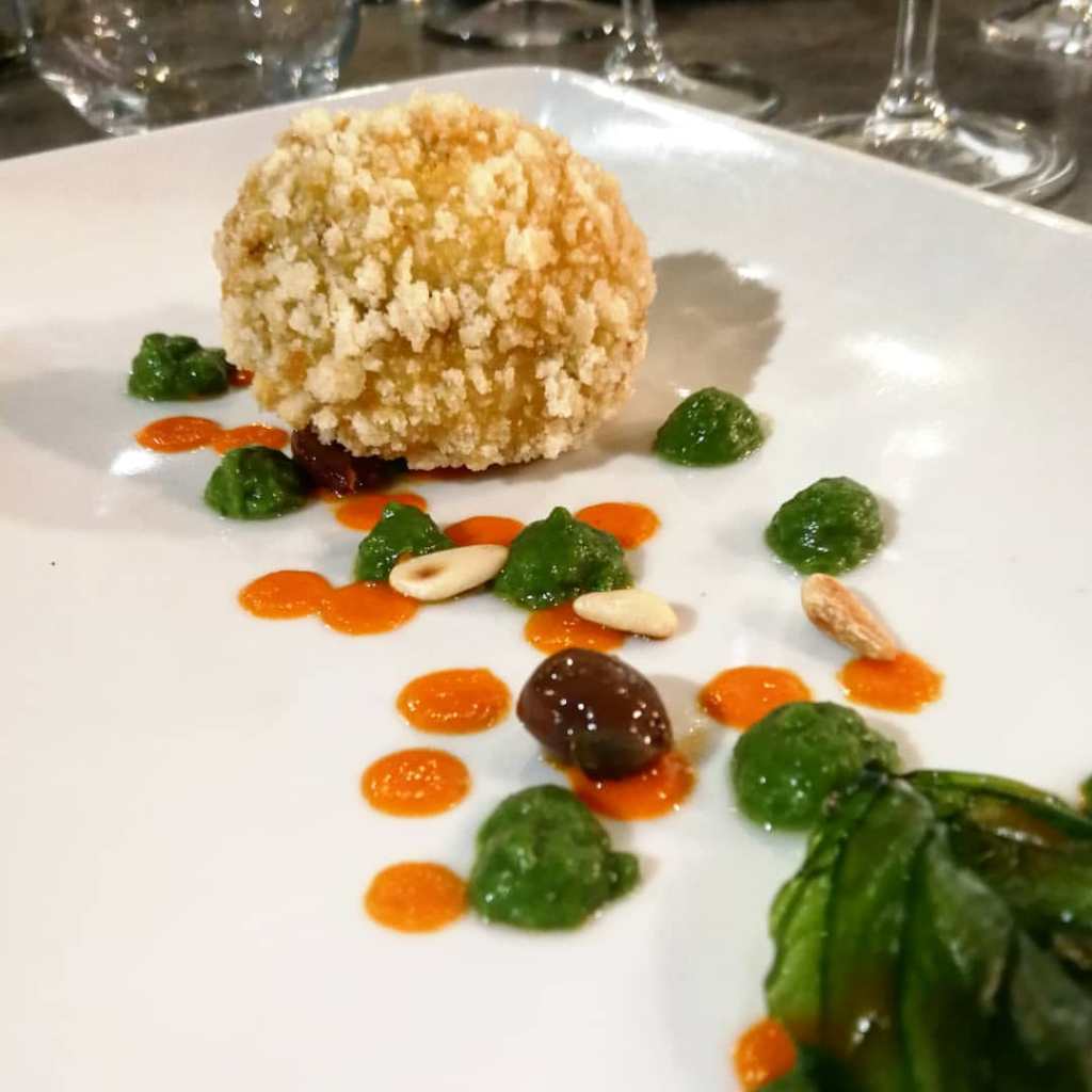Negli antipasti il baccalà sale in cattedra, servito alla veneziana e sottoforma di polpetta in pane panko con pinoli, olive taggiasche, provola e pomodorini confit su scarola di Avezzano. Delicatezze.