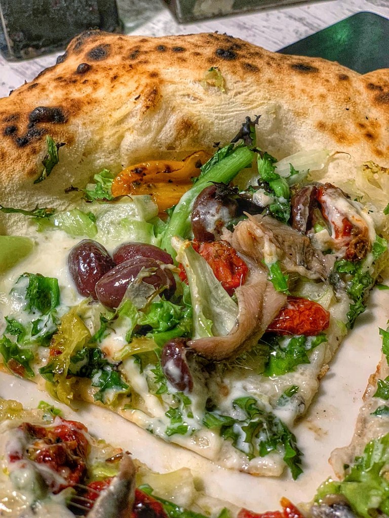 Scarola riccia, pomodoro del Piennolo, pomodorini gialli da serbo, capperi di Salina, olive nere Caiazzane, burrata di Bufala, alici di Trapani, olio evo.
