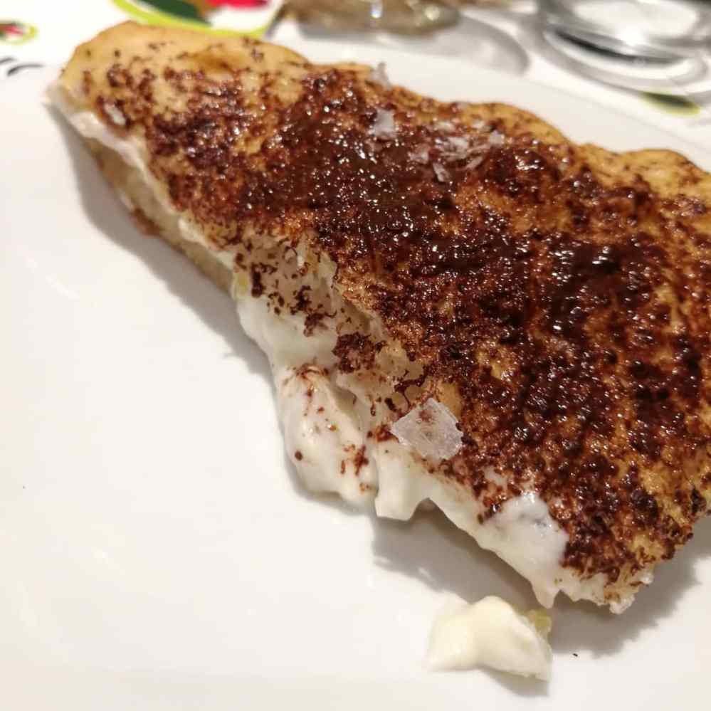 La prima declinazione di Cristina mi ha letteralmente mandato in sollucchero: sarde affumicate, cipolle in agrodolce e giuncata. Iniziare col botto. La fetta diventa sede di accordi che toccano tutte le note. Saporita, dolce, cremosa, ho perso la testa.