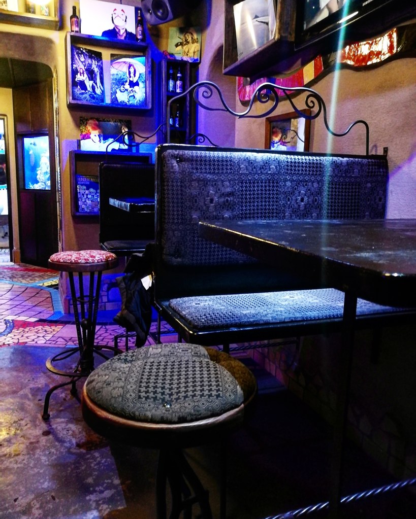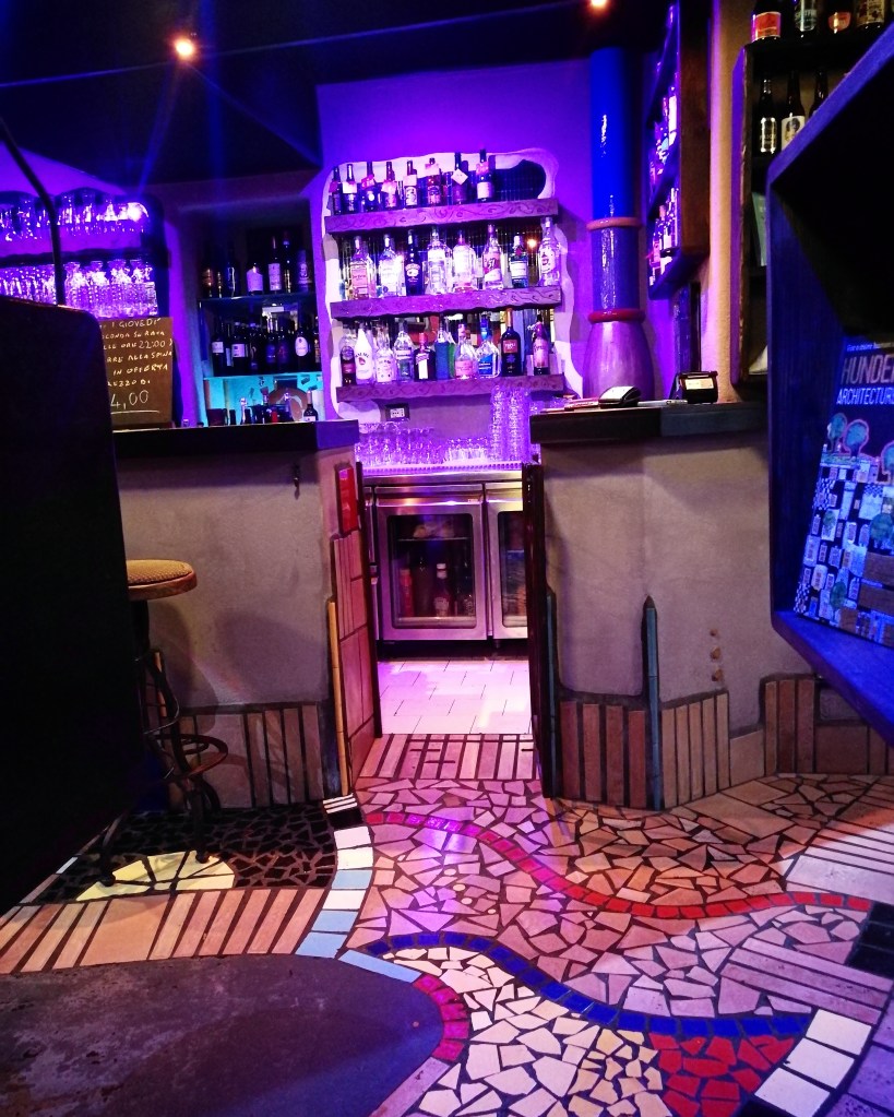 Il locale è una sorprendente architettura sostenibile ed eco-friendly che prende ispirazione dalla notissima Hundertwasserhaus dell’artista Friedensreich Hundertwasser: una mixology di mattonelle, sgabelli, lampadari, lo stesso spillatore, tutti realizzati da Marco a partire da materiali di recupero, creando un’unicità di dettagli che, detto tra noi nel gergo, si chiama arte.