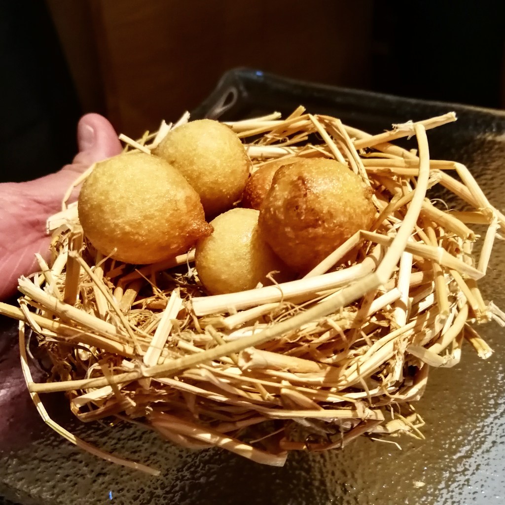 Pepita di patate di casa Salvo e Ovetto al tartufo bianco in pastella, servito in un nido vero: il gioco inizia così, con il primo sussulto vibrazionale. Ancora appetizer con l’idea di pizza di Giuseppe implosa in un bao cinese cotto al vapore, tostato e ripieno di marinara con acciughe; un bocconcino saporitissimo, forse solo un po’ asciutto.