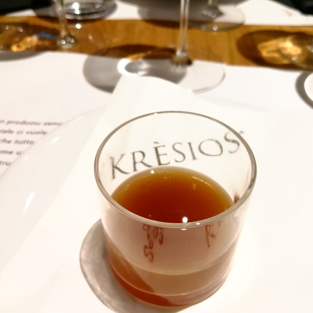 Poi il colpo di genio dall’impronta leonardesca: la celeberrima Cosacca dei Salvo viene letteralmente distrutta in cucina con azoto liquido e diventa liquida, pizza da bere sotto forma di brodo, un Dashi che sapeva, nei profumi e nel sapore, veramente di impasto, pomodoro e pecorino. Ho bevuto un brodo di lacrime di gioia…