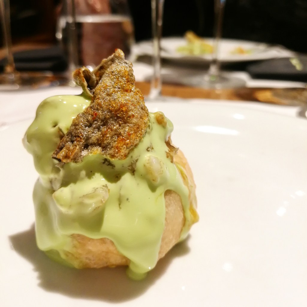 La filosofia di Giuseppe che professa una “stagionalizzazione” totale degli ingredienti con tecniche si esprime nella Montanara con provola, pomodoro liofilizzato e kimchi di scarola napoletana, immersa in acqua e sale e lasciata fermentare tre mesi in acqua di ostriche. Sapore forte, piccante e acido allo stesso tempo, dove il mio palato si è trovato ingenuamente impreparato.