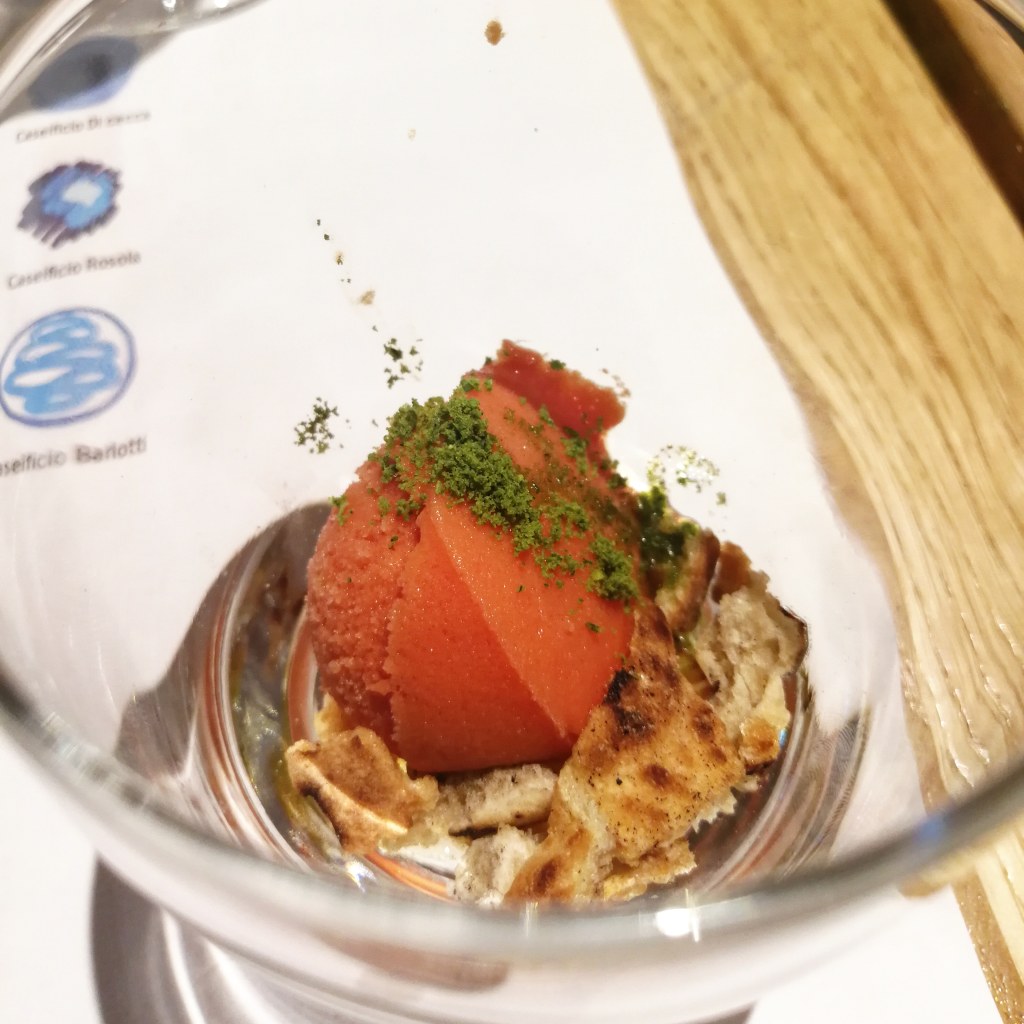Infine, seduzione del palato e dell’intelletto: la pizza diviene gelato, con crumble freddo e croccante di cornicioni, pallina gelida di estratto di Piennolo, pesto di basilico e olio evo. Un’opera 4D, un rimodellamento della realtà, futurismo senza retorica. Meraviglia!