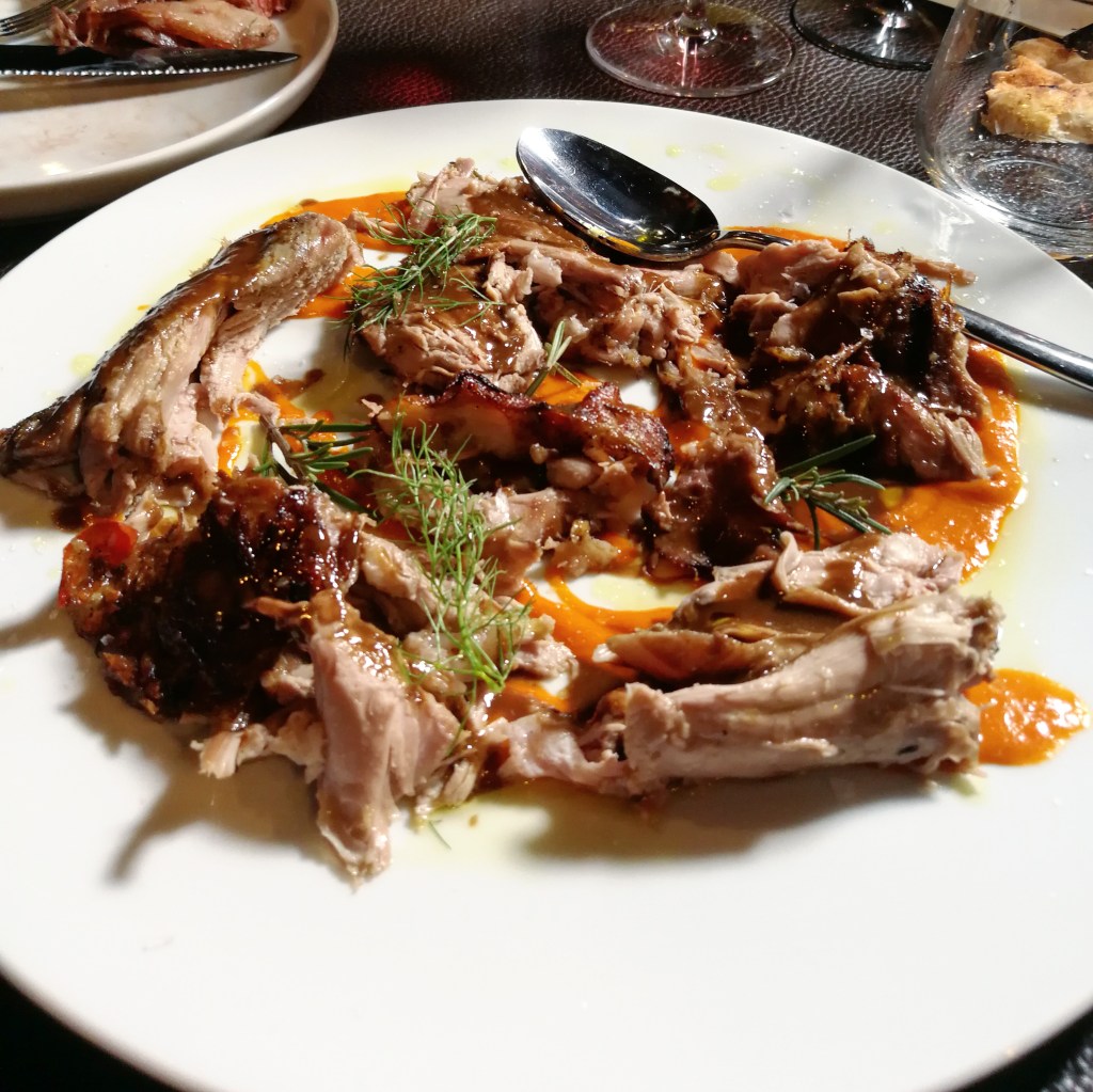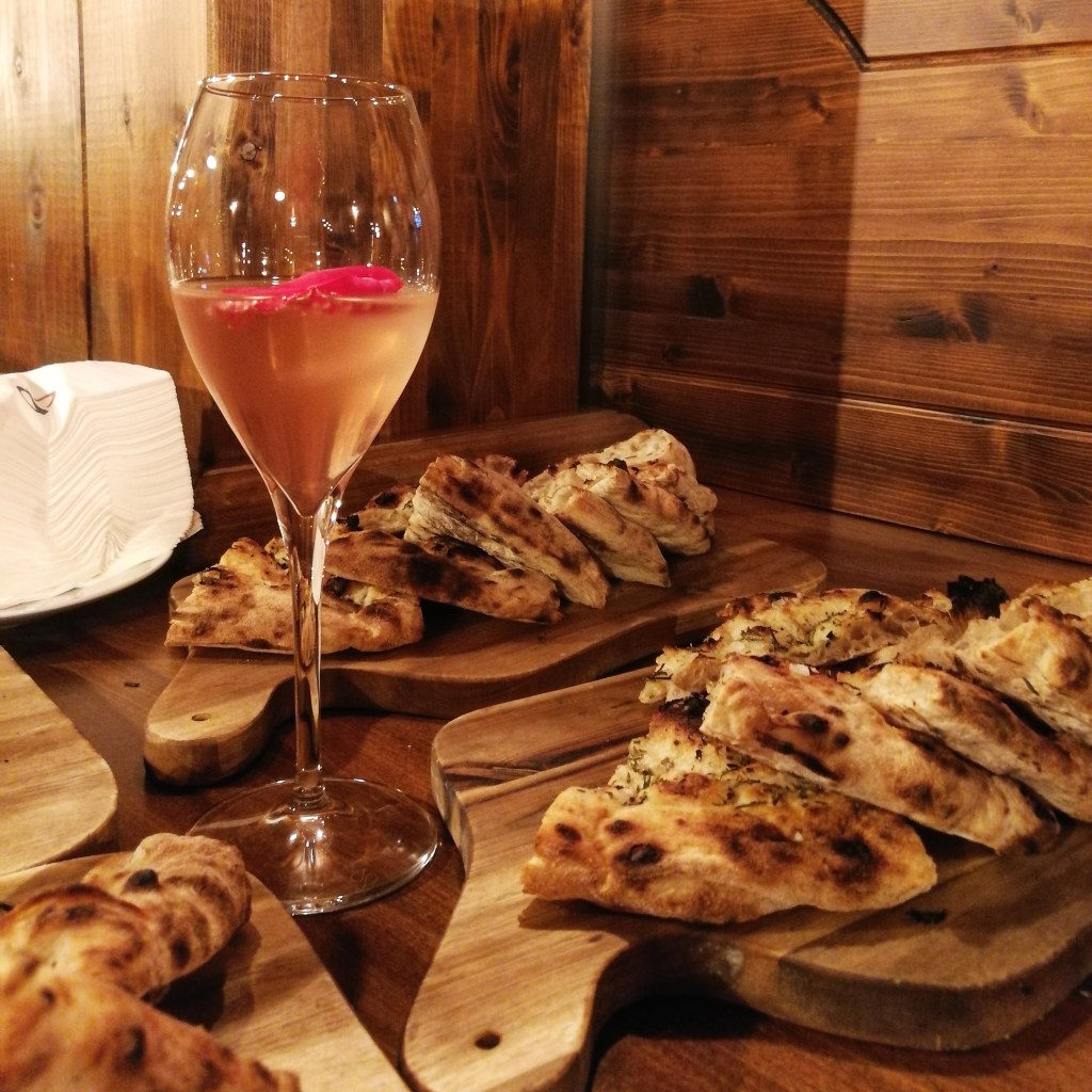 Prologo appetitoso con alici in tempura, croccante di bufala e pane raffermo, ribs di maialino con chutney di mela annurca e spicchi di focaccia, quest’ultima leggera e scrocchiarella, fatta con una farina bio di tipo 1. French 75 al mirtillo a sgrassare il tutto!