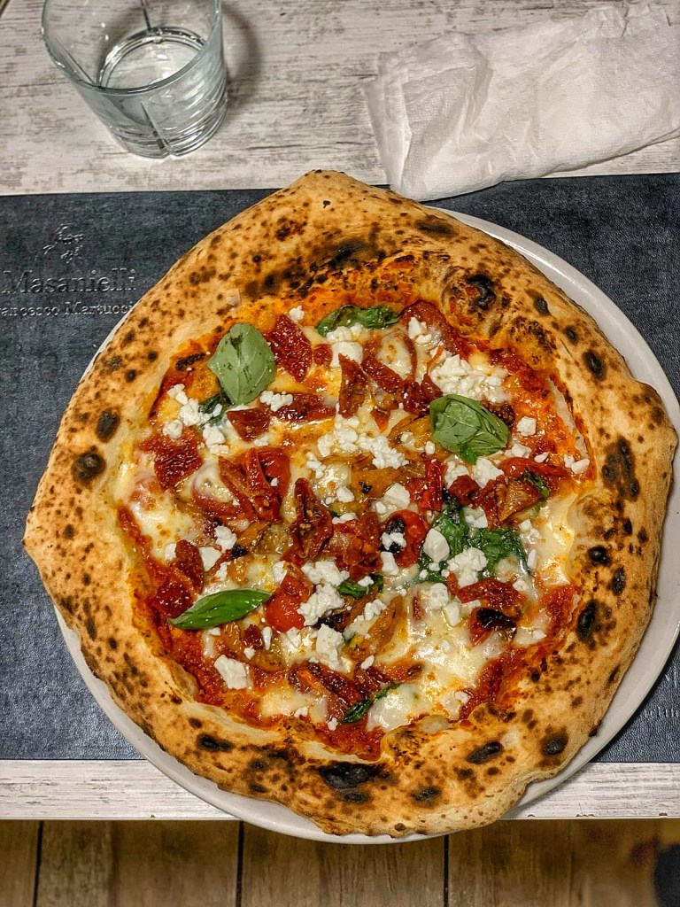 Ma a svegliarmi non ci pensavo minimamente… e il sorrisone di Vincenzo Esposito emanava conforto e gioia tra le Case Nuove. Senza correre e senza mezzi pubblici, ero già lì. Come a casa. Dama, Elena Ferrante, Elisabetta Farnese, come un cammello avrei fatto una scorpacciata di emozioni. Ma rimasi fedele alla sacralità di un dono di straordinaria bellezza, perché la Don Alberto batte all’unisono col mio cuore! Bionda e un po’ rossiccia come me, marinara audace con pomodorino giallo, arricchita di salame napoletano e basilico riccio napoletano. Verace, autentica, saporita, dolce, fresca, speziata e profumata. L’essenza di tutti i sapori su un disco troppo napoletano! Un’opera d’arte culinaria, una sintesi di maestria, gusto e napoletanità. Mi perdoneranno le Donne di casa per la mancata galanteria, che Dio mi fulmini se fu menzogna che al cuor non si comanda! L’abbraccio senza metri di distanza con il maestro, sempre sfavillante di novità da far assaggiare, ma la mia giornata non era ancora finita…