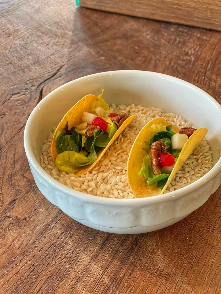 Sfiziosi e creativi i Tacos al pecorino, erbe, pere, lamponi e ponzu. Gradevolmente freschi e scricchiolosi.