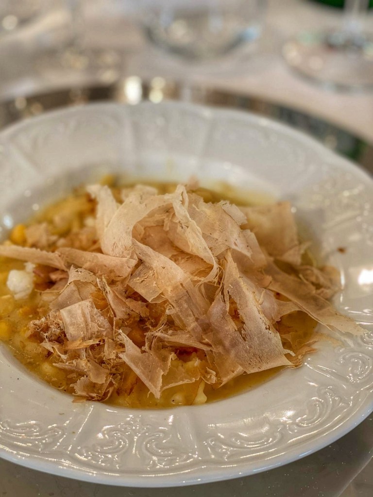 Modernismo e visioni mistiche alla presenza di Ceci e baccalà con katsuobushi: una vivacità visiva che accolse una contaminazione perfetta tra sapori autentici nostrani e fermentato orientale. Maestria inappuntabile.