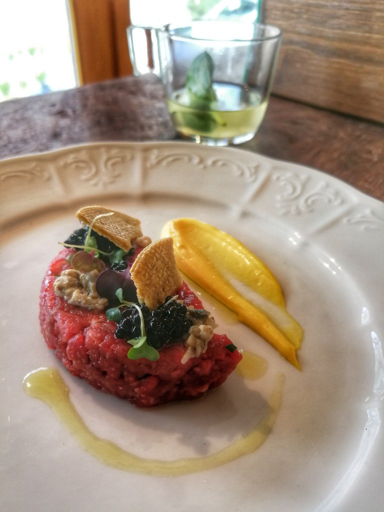 La Tartare di manzo, ostriche e rafano un concerto ben riuscito, con la carne pregevolmente coccolata e il connubio terra e mare perfettamente idilliaco. Il tutto annaffiato da un dashi al basilico ad aumentare i moti vibrazionali al palato.