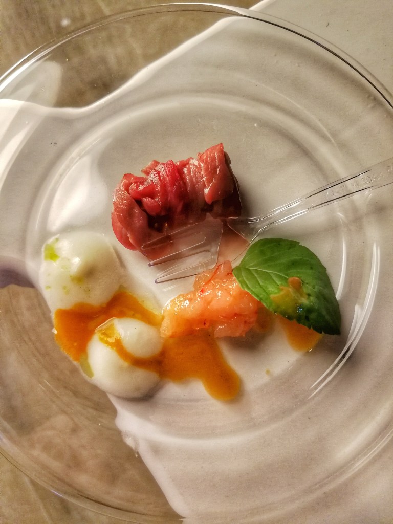 Nei crudi la Marchigiana ruba la scena e mo con gambero rosso, salsa di gambero e mozzarella agli agrumi e mo vestita da sushi con ventresca di tonno e prugna umeboshi.