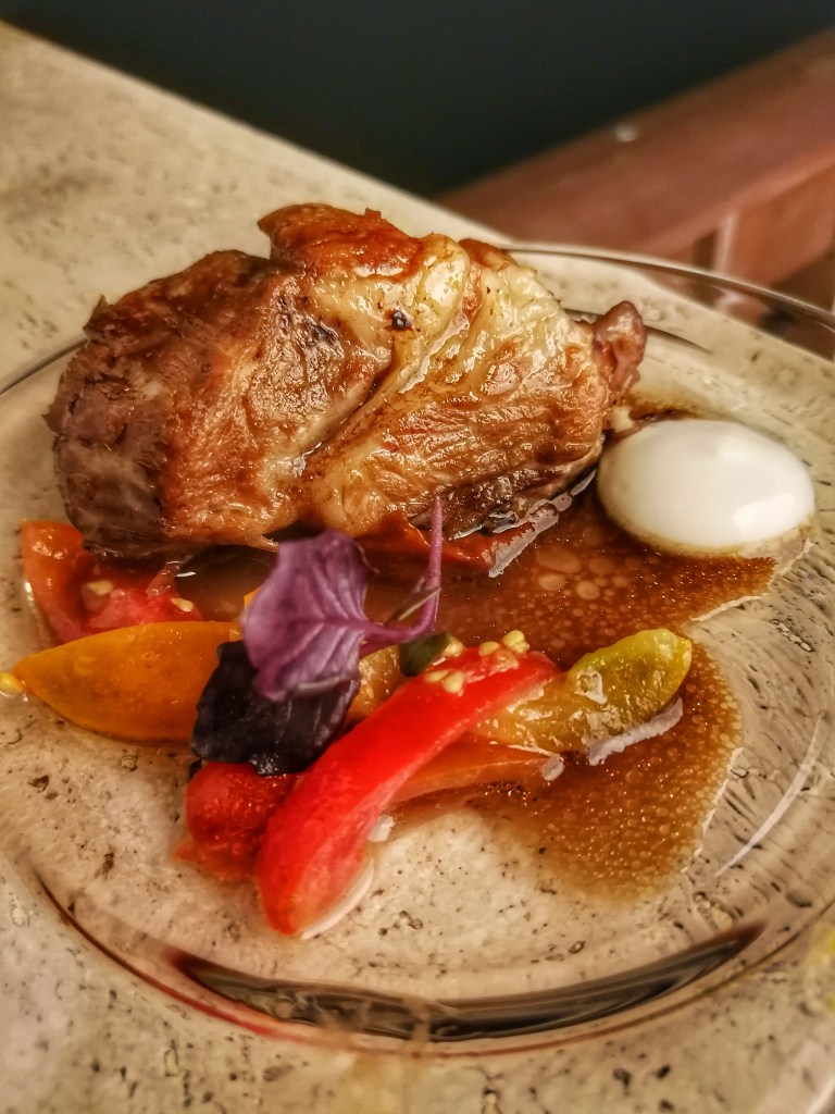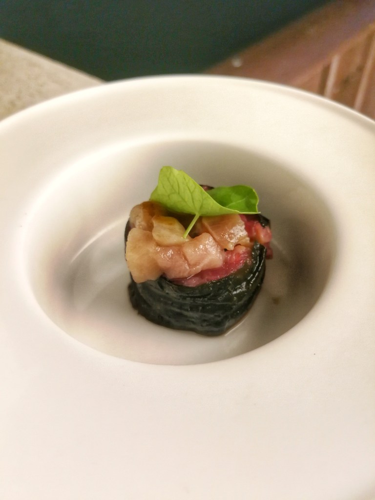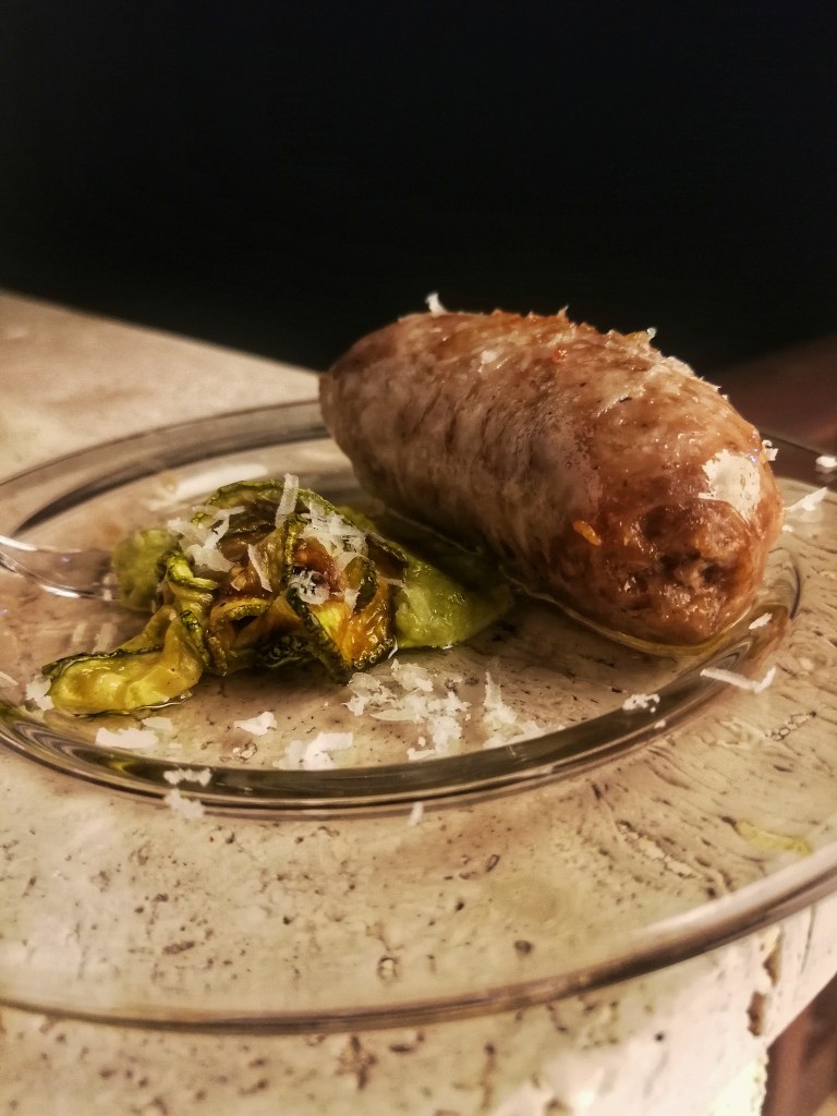Magistrale il Collo di maiale cotto 24 ore alla “Marinara” di cinque pomodori, dove la delicatezza della ciccia si abbandona alla nota acida dei cinque. Simpatico e vincente l’abbinamento della salsiccia con le note della Nerano, più ardito e complesso quello del manzo con asparagi alla scapece di ponzu e cocco.