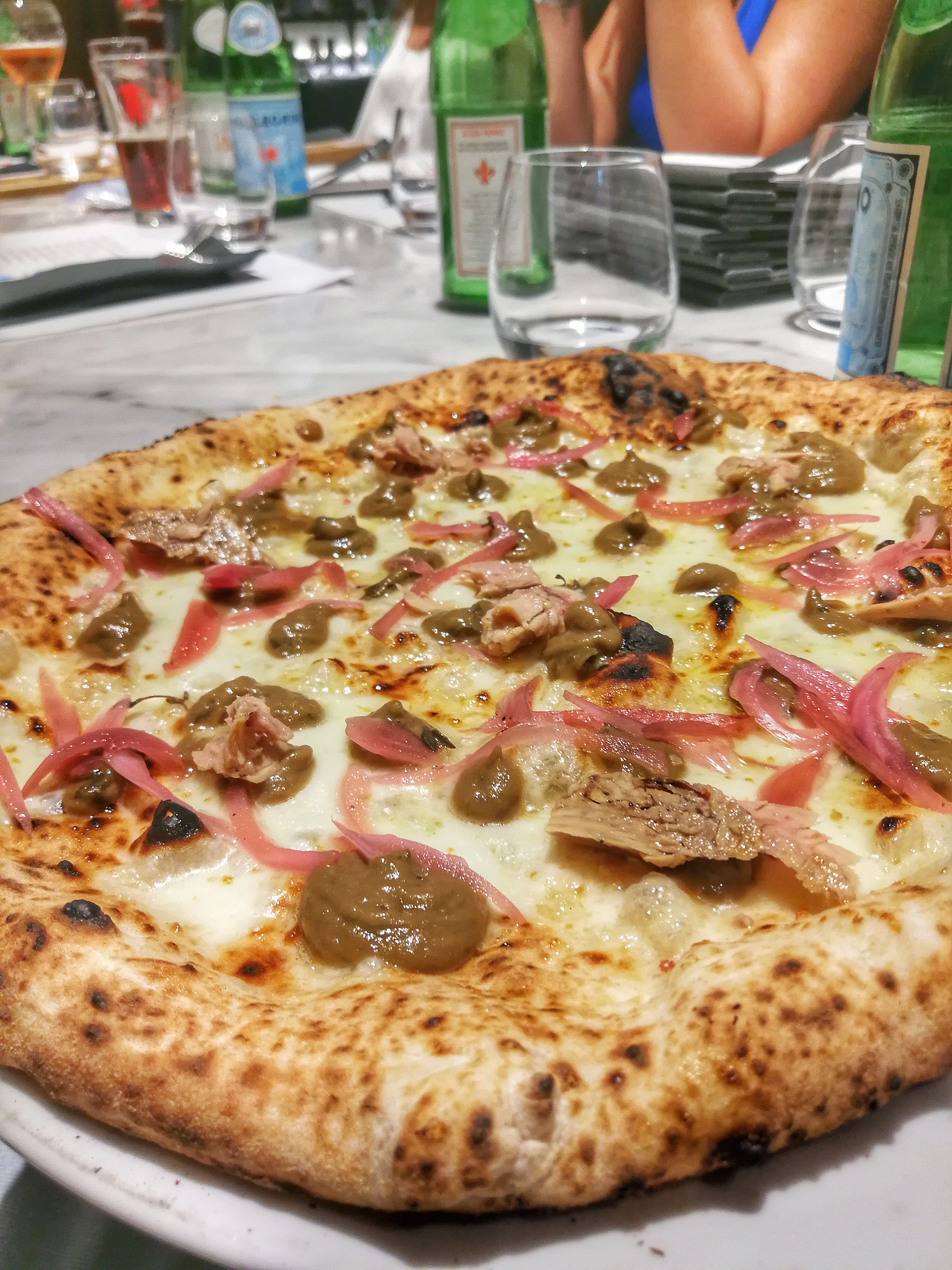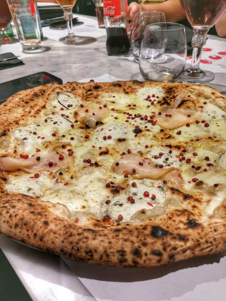 Indovinata, estiva, briosa e spumeggiante la Fresellla: battuto di pomodori di Gragnano e mozzarella in tre consistenze: stracciata di burrata, bufala campana DOC e dadolata di fiordilatte; infine una pioggia di pane croccante aromatizzato a titillare il palato. Una pizza che si lascia gustare senza esitazione, fresca per il battuto, gagliarda per la consistenza dei latticini, giovanile per il crunch, disarmante per la semplicità dei contenuti. Lode con menzione.