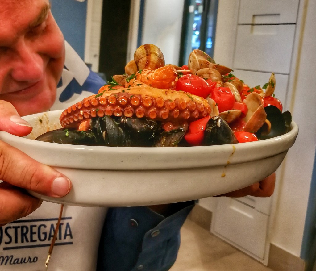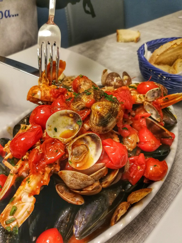 L’inverosimiglianza, caposaldo della narrazione, cede all’arrivo, in pompa magna, della coprotagonista. Cozze flegree (Bacoli o Capo Miseno), pomodori tondini Gustarosso, mazzancolle o scampi freschi secondo disponibilità sul mercato (con una versione extralusso con l’astice), polpo fresco, olio evo, crostini di pane homemade, peperoncino. Una zuppa di cozze dalla commozione estetica intensa, succulente, viva, dall’insolito (ai miei occhi) colore fuoco, non “sporca” ma sommersa dall’oro rosso. Pathos alle stelle.