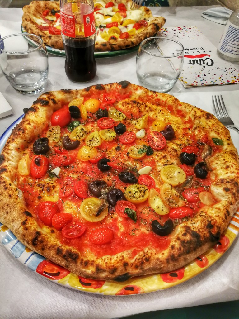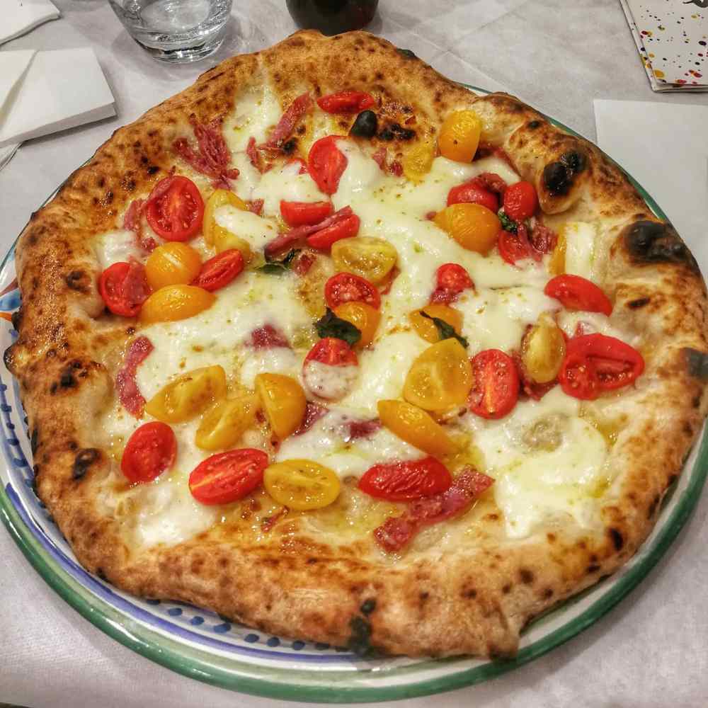 La Don Antonio, marinara vestita a festa, con pomodori del piennolo Gioli rossi e gialli, olive nere e acciughe, per la rilevanza della dedica.