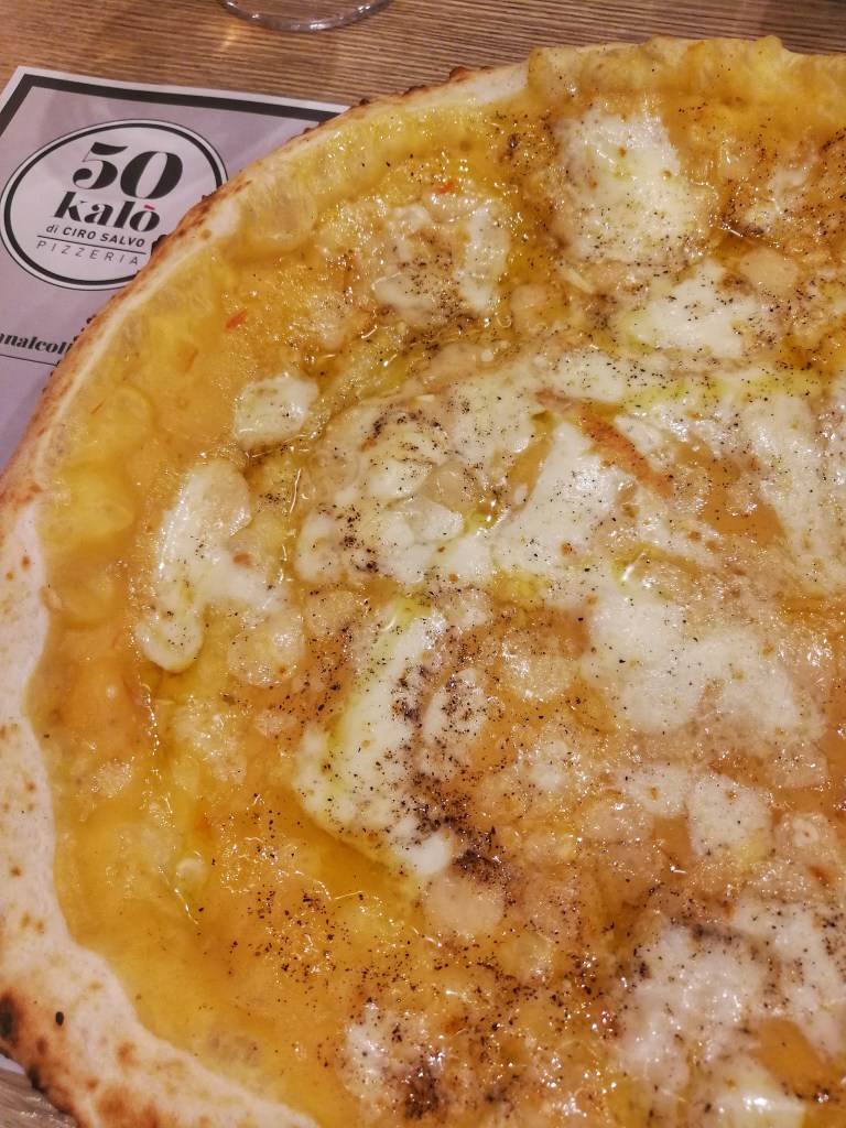 Una pizza sorprendentemente delicata e intellettualmente precisa, equilibrata che non eccede in sapidità, un effluvio di suggestioni che al palato riaffiorano come costellazioni di bellezza!