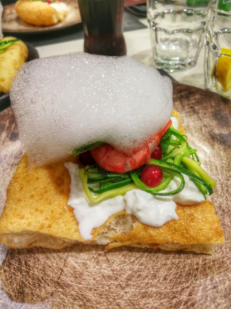 Degna di encomio, dorata e immacolata di olezzo la frittura della montanara per la Rossa di Mazara con gambero rosso, stracciata di bufala, zucchine marinate al sale maldon e olio evo, ribes e aria di limone: l’audacia del fritto spinge la delicatezza del gambero che gongola nella cremosità del latticino; ridosare l’aria di limone, scenograficamente accecante ma accade che anche la troppa aria non fa respirare.