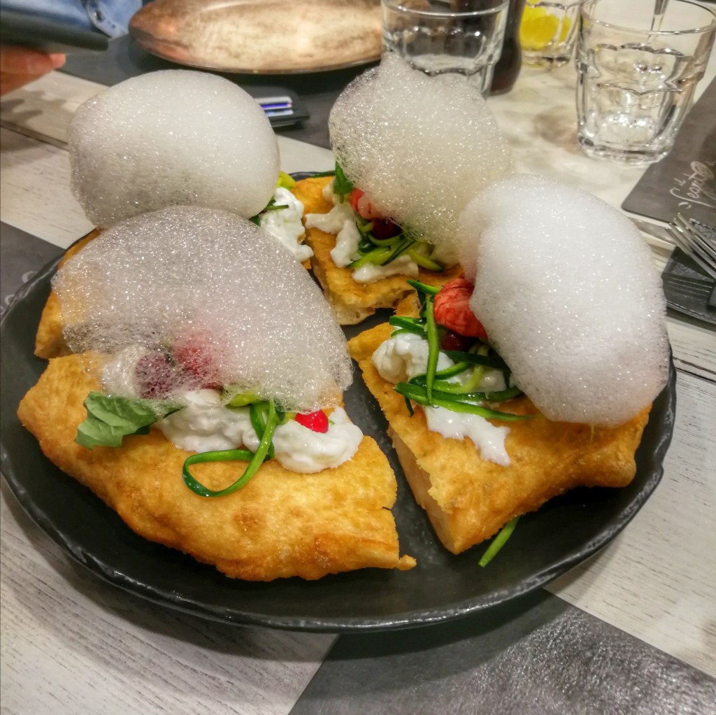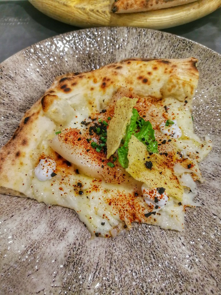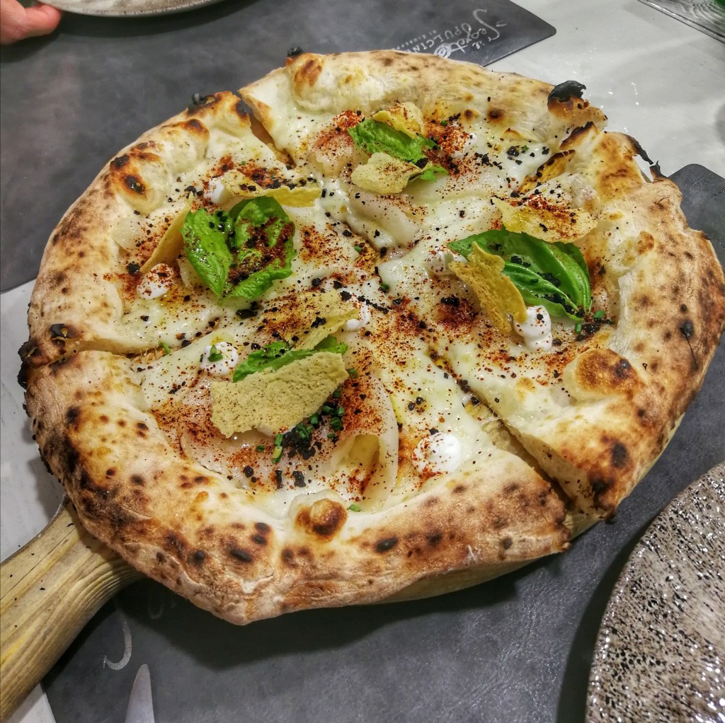 Soffermarsi sulla mirabilità della scelta degli ingredienti del territorio, che danno unicità al suo prodotto, è la chiave perfetta. Dal mare alla terra, dagli oli ai formaggi, eccellenze su eccellenze con quella capacità di Giuseppe di rispettarle, esaltarle e mai distruggerle. La sua proposta, pertanto, vive tra un equilibrio reversibile di pizza “propriamente detta” (e qui mi avvalgo della licenza poetica) con topping che sposano l’impasto sin dalla stesura e di pizza che accoglie all’uscita una combinazione di giochi di consistenze, temperature, accostamenti ossimorici, dove l’impasto, talvolta, diviene attore non protagonista.