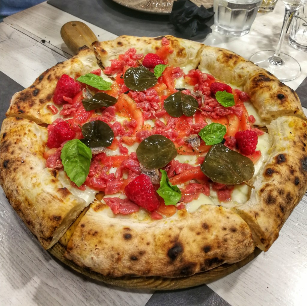 “Carneade! Chi era costui?” ruminai all’assaggio della Pizzaiola a modo mio, affrescata alla maniera del Pinturicchio: fiordilatte, sovrano di bufala, falde di pomodoro ramato condite con lamponi, origano e sale maldon, battuto di Marchigiana, alici di Cetara, foglie di cappero, basilico, olio evo Seleca con aglio nero di Voghiera DOP. I pomodori e i lamponi a due temperature, caldo-freddo, il dolce acidulo che vince su tutto e il mio limite alla foglia di cappero. Profumo di oso.