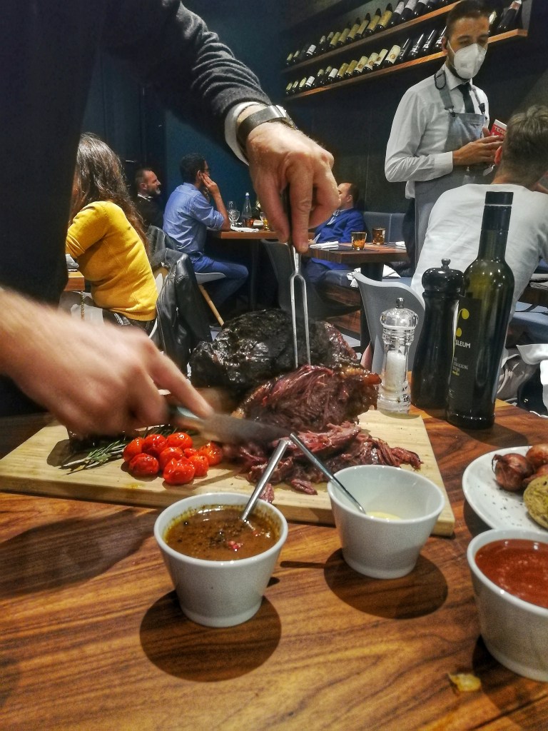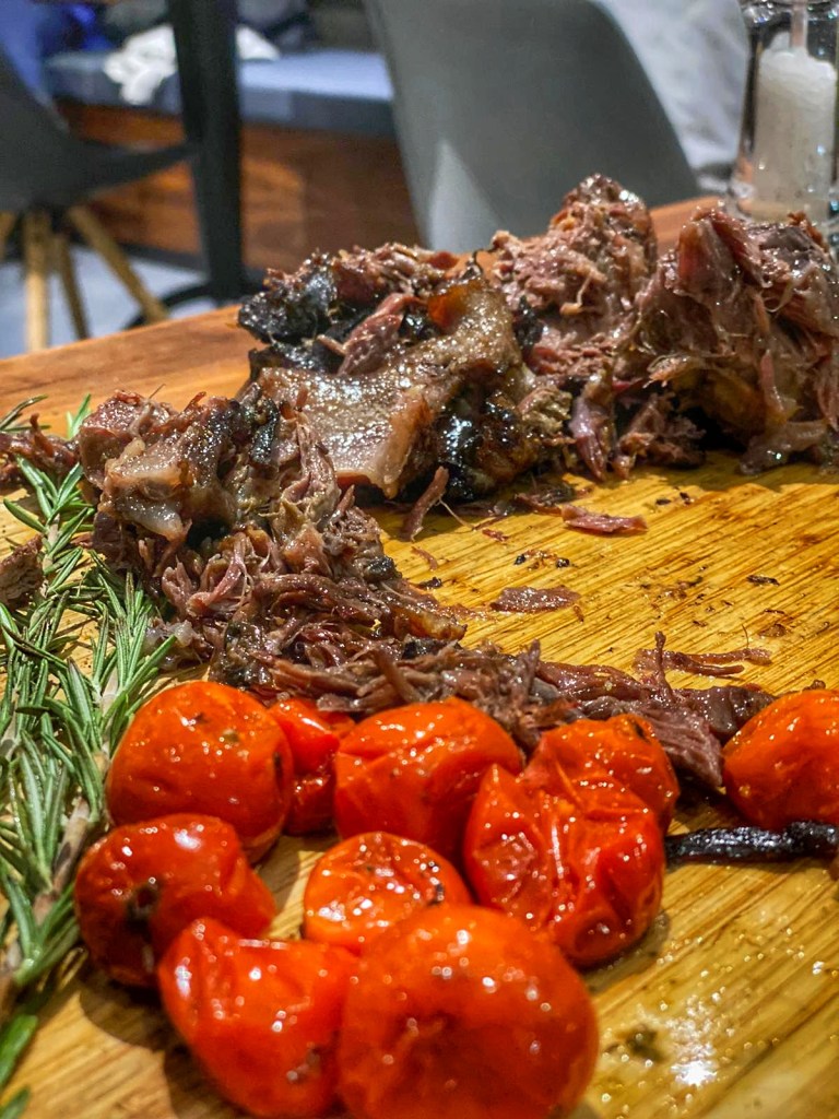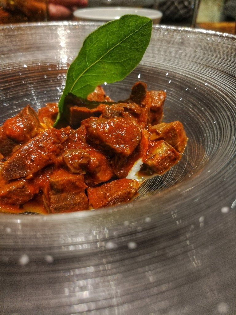 No, non si tratta di tomahawk, eppure la clava c’è tutta: stinco di Frisona all’Aglianico cotto a bassa temperatura servito con patate e cipolle e mostarda, riduzione di Aglianico e ketchup napoletano (su quest’ultimo ci ho lasciato il cuore!).