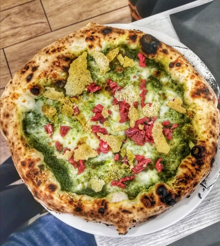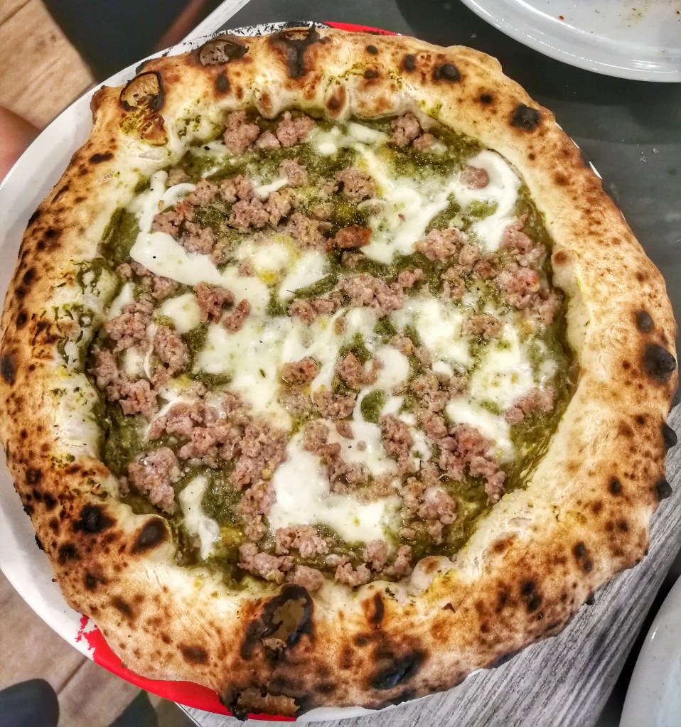 La cottura poi torna classica, quella da forno, ed esplode il food portrait. Il topping cambia vita, Francesco scompone per comporre e scompone per ricomporre. E mo con la sempreverde Mani di Velluto, vellutata di friarielli in acqua di ricotta di bufala, mozzarella di bufala campana DOP, salsiccia a punta di coltello di suino grigio ardesia e calcagno a crosta liscia, dove il verde è accogliente, l’amaro è cremoso e smussato, la ciccia dona lo zing e la pecora incornicia il morso.