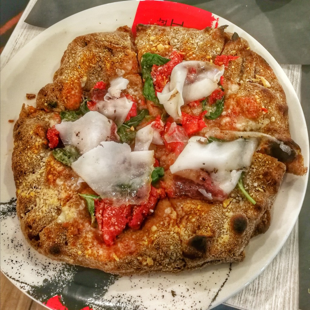 La tri-cooking rivoluzione (vapore 100° C, fritto 180° C, al forno 400° C) che ridistribuisce i confini della leggerezza croccante dal centro al confine. Non per inciampare nelle parole ma un vero esercizio di simmetria che trova la massima espressione nella Futuro di Marinara: crema di pomodoro arrosto, pesto di aglio orsino, capperi di Salina, olive di Caiazzo, alici di Trapani e origano di montagna. La coniugazione di vista, olfatto e gusto, un crunch atavico, un sapore moderno, una realizzazione leggiadra e senza tempo che delimita una fetta di mondo.