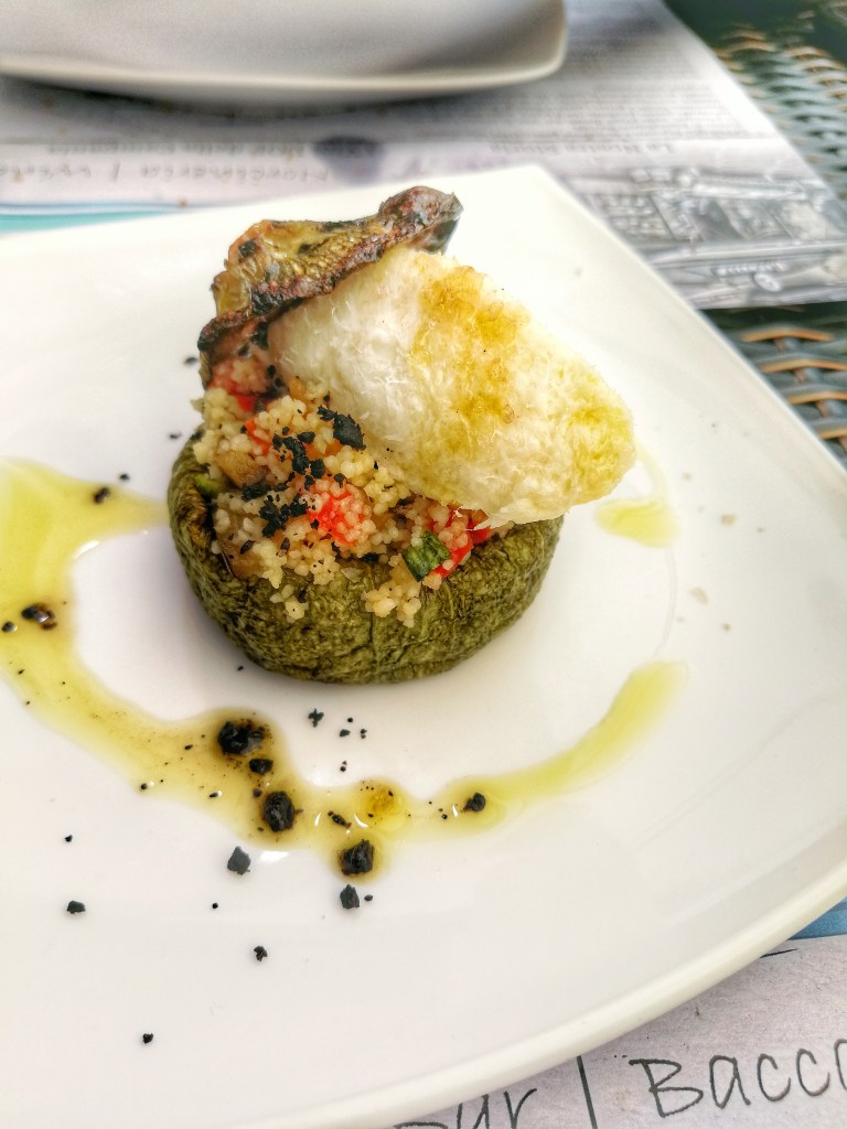 Lo Zuccotto ripieno di cous cous alle verdure e baccalà mantecato un’idea brillante, fresca e giovanile. Il cous cous titilla, il pesce da sapore e l’ortaggio allunga. Perfetto brunch sull’erba.