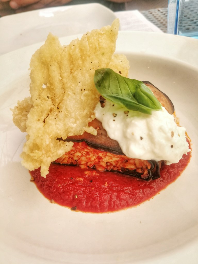 Apoteosi per il Rotolone di melanzane ripieno di ricotta salata e baccalà, con burrata e chips di baccalà immerso nel pomodoro San Marzano. Una felicità estrema, composizione da fuoriclasse, un corredo di sapori che toccano tutto lo spettro di gusto. Mirabilis.