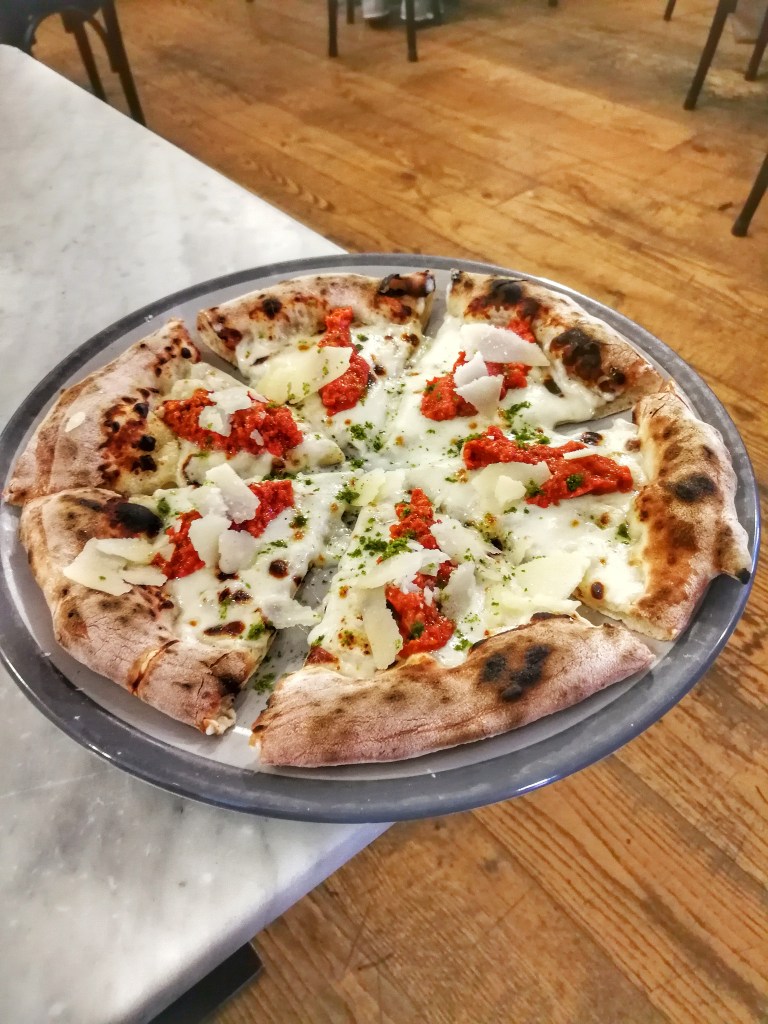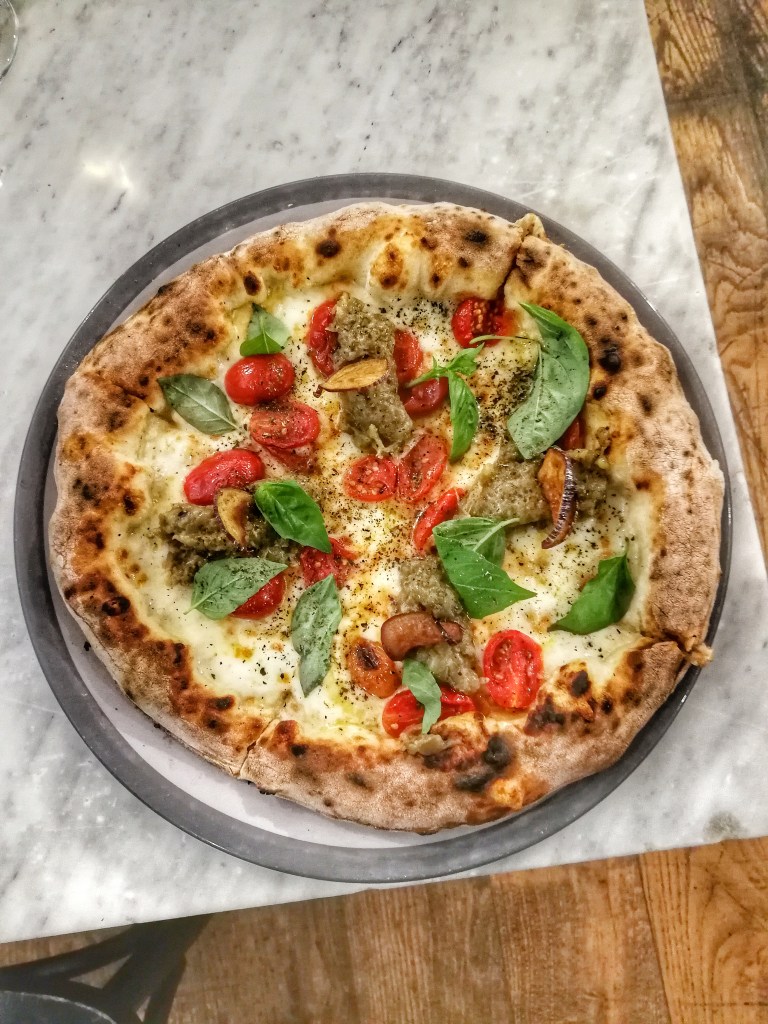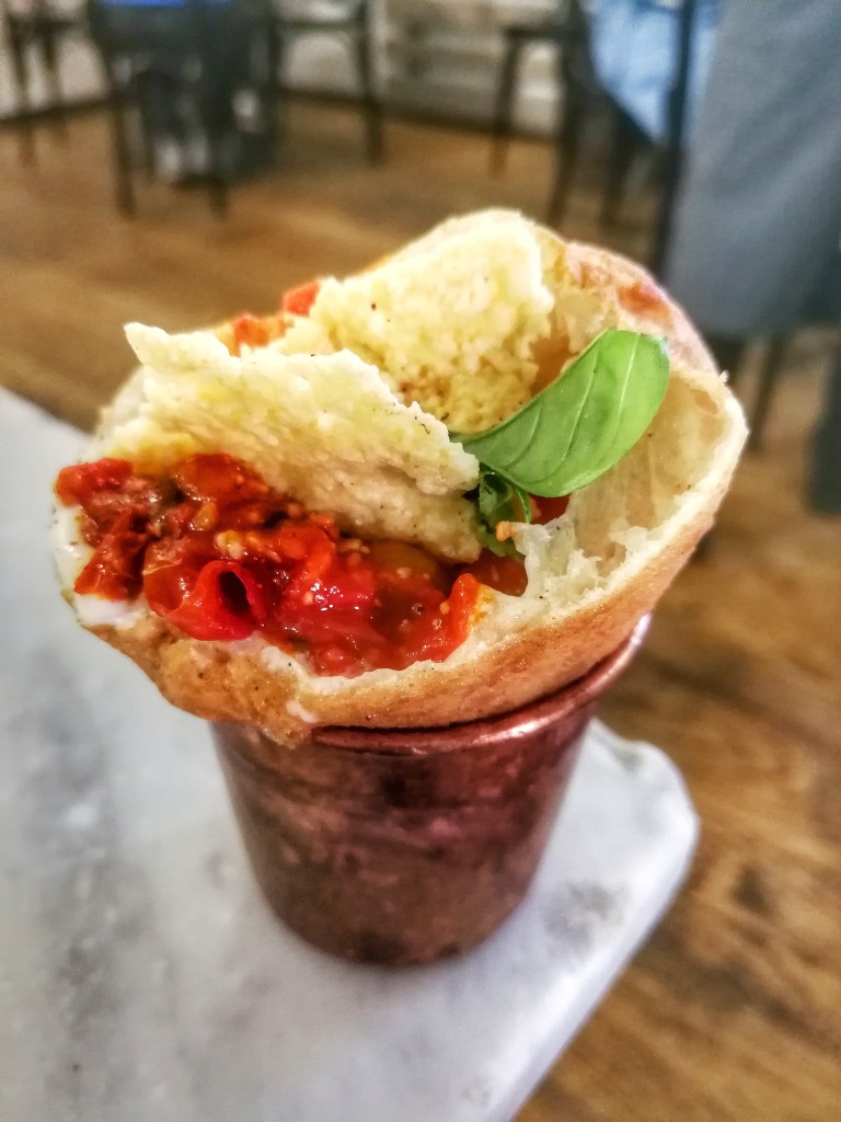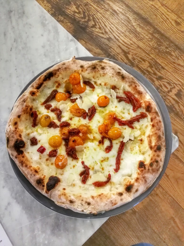 Sua maestà il pomodoro in veste, colori e stato fisico diversi per lo Sfizio. Giallo Lucariello e San Marzano essiccato al sole con sale di Trapani sfidavano il palato, componevano tra bemolli e diesis. Una pizza che sorride.