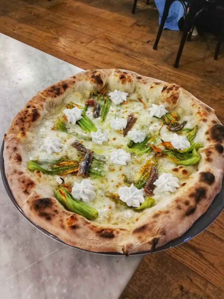 La Fiori di zucca è stata un esercizio di simmetria. Rispetto ed esaltazione degli ingredienti: fiordilatte, scamorza affumicata, fiori di zucca, acciughe di Cetara, ricotta di bufala, pepe. Idea che gira ma qui l’esecuzione è accademica. Camouflage tra fiori e latticini di dolcezza e cremosità, briosità della spezia e lo zing esplosivo dell’acciuga. Il Bello e il Sublime.