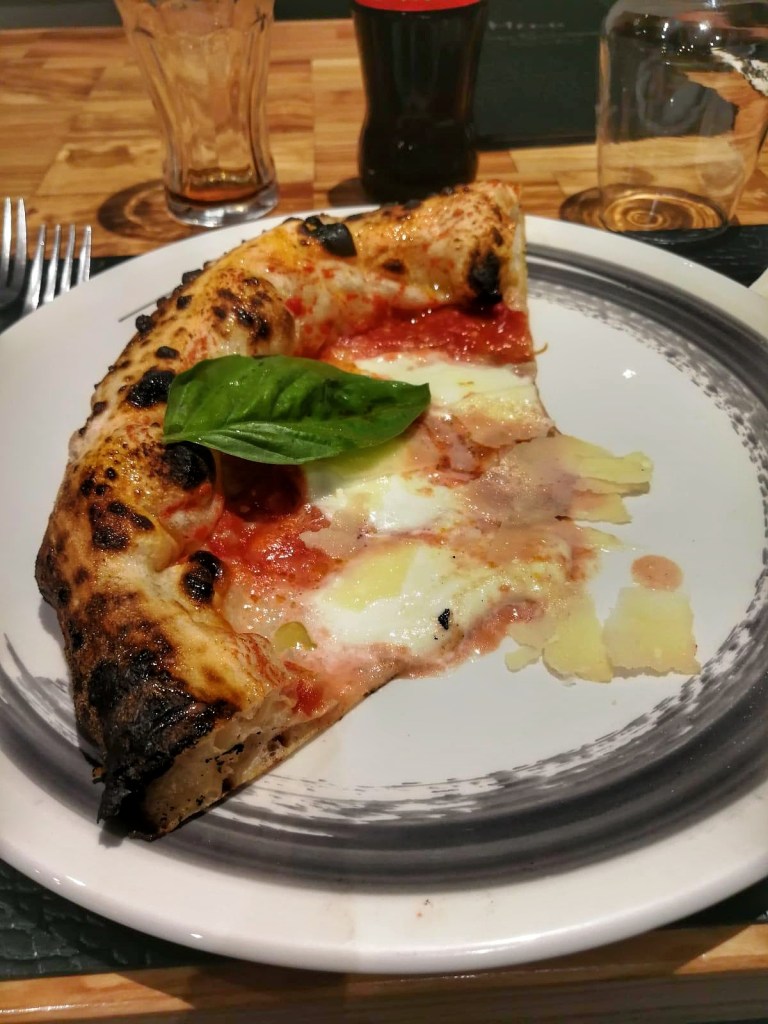 Margherita, qui è Queen, esaltata. San Marzano schiacciato a mano, mozzarella di bufala, parmigiano vacche rosse, evo in cottura e all’uscita. Sapore disarmante, colpito al primo colpo. Perfetto equilibrio tra acidità e dolcezza e la pasta abbraccia e non sbiadisce come mero supporto. Ottima coniugazione di vista, olfatto e gusto.