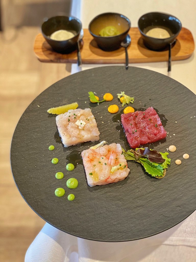 Uno xilofono di mare la trilogia di tartare: tonno, branzino, gambero. Tris di salsine ad accompagnare: allo yogurt, al guacamole e maionese al cappero. Consistenze, profumi, giochi di sapidità, freschezza disarmante. Satisfaction.