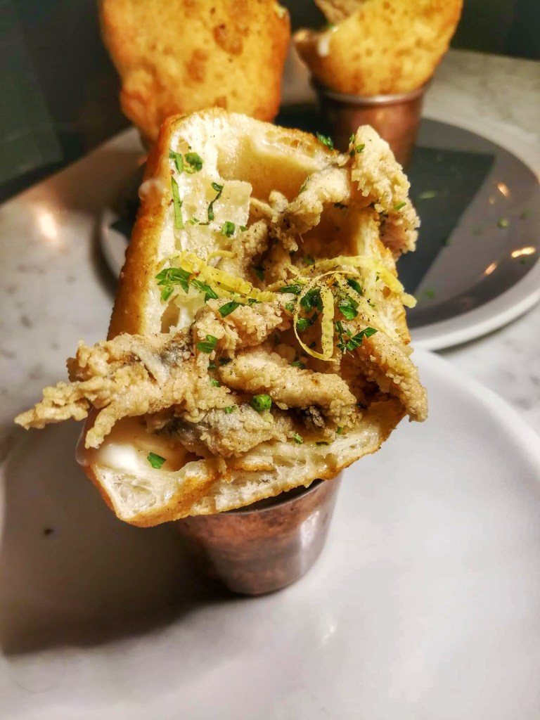 Tratto da una storia vera di uno dei miei artisti contemporanei preferiti che non mi abbandona mai al disincanto. Franco Pepe, visionario d’attacco, veste di mare il suo Ciro e disegna il Cuoppo di Alici. La leggerezza dell’impasto fritto, oro 24 carati, sostituisce il cono di carta paglia e cinge una ghiotta manciata di alici fritte, alla maniera napoletana, un goccio di fonduta di Grana Padano, cuore di limone, pepe, prezzemolo, zest di limone. Un gioco di mare, la sofficità dell’involucro, le spezie che titillano, la consistenza delle alici che incrociano la cremosità del ripieno che esplode in freschezza con l’agrume che resetta il palato.