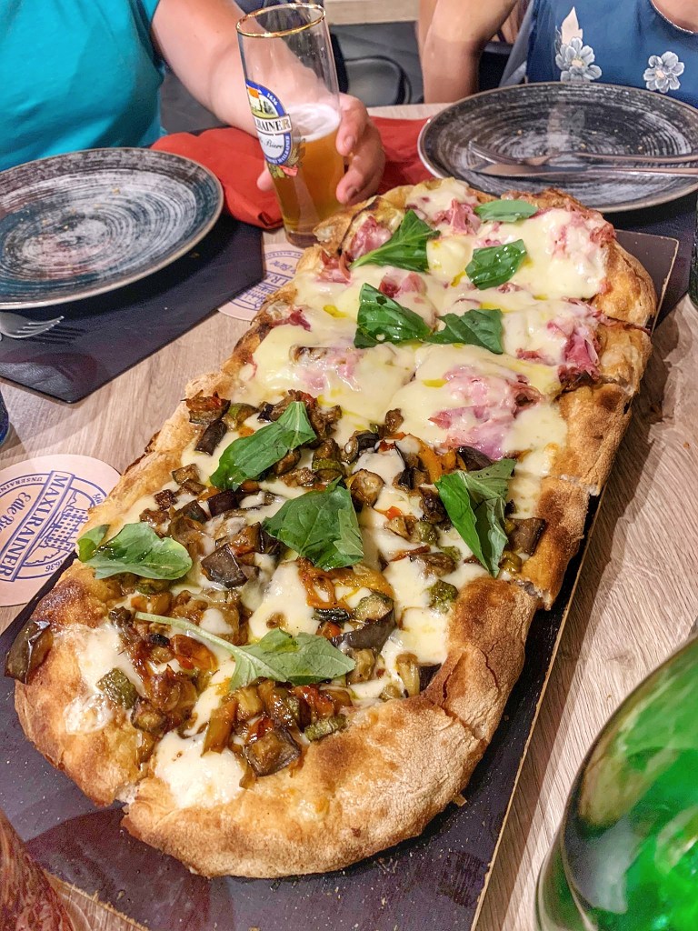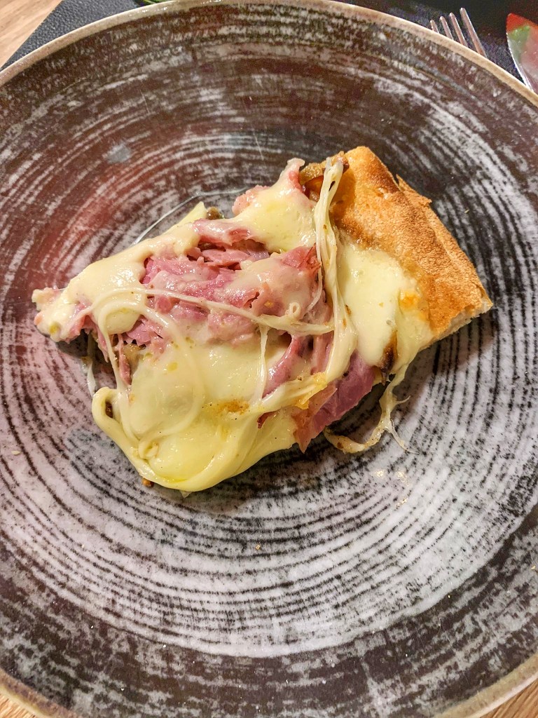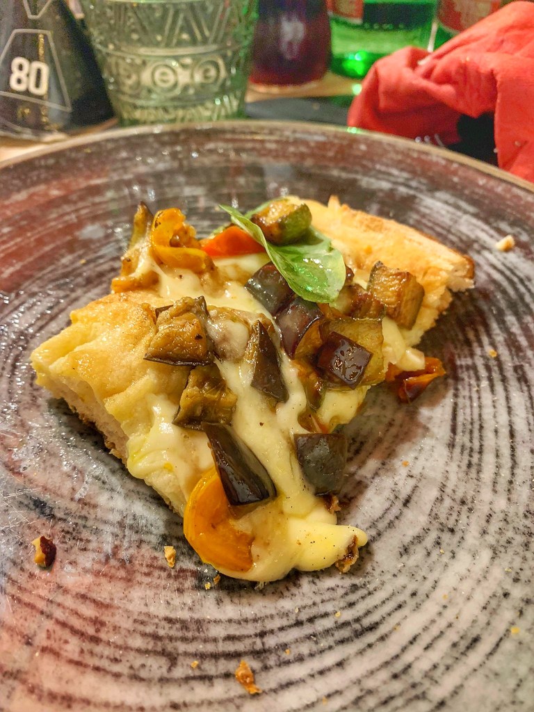 “Mirabilis!” Alveolature impressionanti, mentre la mollica cresce in altezza, aerata e leggerissima. L’Ortolana vince in sapore e stagionalità, la Parmigiana Bianca con besciamella di latte di bufala, melanzane, provola di bufala, prosciutto cotto di Parma, una stratificazione perfetta, una millefoglie luculliana che intriga per il contrasto sotto/sopra. Una batteria per il cuore.